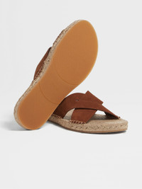The dark Foliage suede espadrille sandals are inspired by a classic Mediterranean style. INFO Replacing the usual canvas with luxury materials, the dark Foliage suede espadrille sandals exemplify Zegna's vision of effortless elegance. Tonal lining is soft against the skin, while the roped midsole is paired with a durable rubber outsole. PRODUCT CODE LHCSR-A5964Z-VIZ MATERIALS AND CARE Suede Protect from moisture and do not place near direct sources of heat. Clean with a brush designed for use with suede. Avoid contact with cosmetics, perfumes and hand lotions and sanitizers. Store in a cool, dry, well-ventilated place. Stow in the included dust bag when not in use. FIT AND PRODUCT DETAILS • Upper in calfskin • Tonal lining • Roped midsole • Non-slip honey-colored rubber outsole • Fits true to size • Comes with a shoe bag