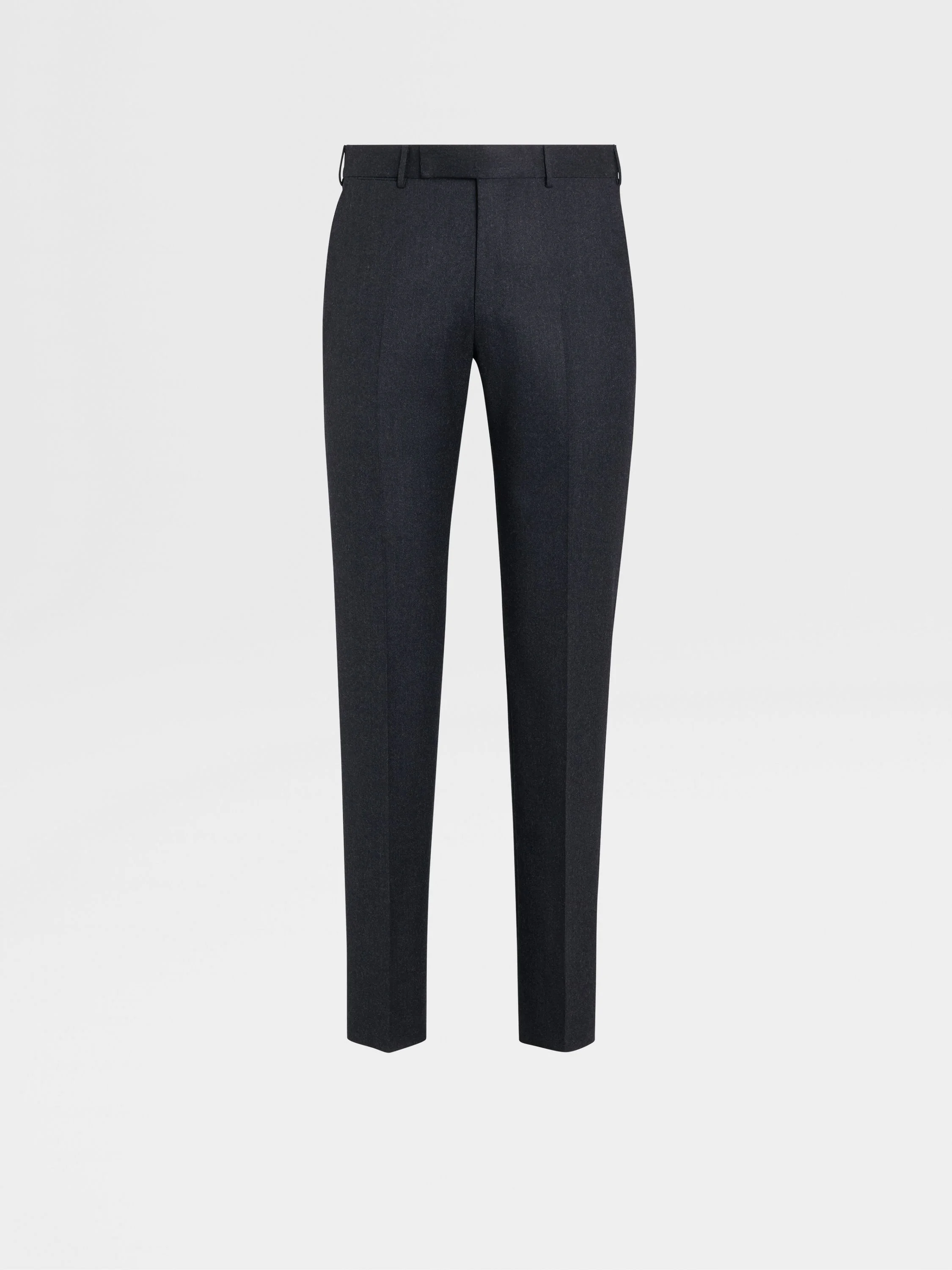 The dark grey wool flannel tailoring pants are made from warm and lightweight flannel. INFO Presented in a classic colorway, the dark grey wool flannel tailoring pants are a staple of elegant wardrobes. The dark grey pants are made from pure wool and are unlined. The slim fit is enhanced with a sleek, flat front. PRODUCT CODE S30F01-75TB12 MATERIALS AND CARE 100% Wool Do not wash. Do not bleach. Do not tumble dry. Iron at max 110°C. Professional dry cleaning in tetrachloroethene and hydrocarbons, mild process. FIT AND PRODUCT DETAILS • Slim fit • Tailoring pants • 18.5 cm hem • Unlined • Button and zip closure • Slanted pockets • Flat front style • Model is 188 cm tall (6.2 feet) and wears an Italian size 48.