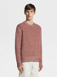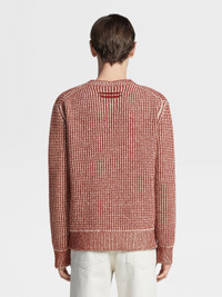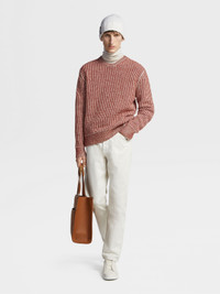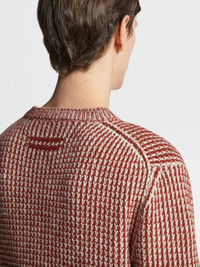 The dark red and light taupe Oasi Cashmere jacquard long-sleeve knit crewneck sweater features an elegant, two-toned pattern. INFO Made from one of Zegna's most exclusive natural materials, the dark red and light taupe Oasi Cashmere jacquard long-sleeve knit crewneck sweater's ultra-fine yarn enhances the sophisticated motif. The contrasting colors make a statement in casual wardrobes. The design is framed by the classic ribbed trim and crewneck collar. PRODUCT CODE UCK53A6-110-140 MATERIALS AND CARE 100% Cashmere This Oasi Cashmere Collection garment was Born in Oasi Zegna, our 100km² natural territory and the home of our values. Crafted from cashmere of uncompromising quality and softness, the Oasi Cashmere Collection follows in the footsteps of our founder, who envisioned a vertically integrated system of producing textiles. Wash by hand. Do not bleach. Do not tumble dry. Flat drying. Iron at max 110°C. Professional dry cleaning in hydrocarbons, mild process. Wash and iron inside out. FIT AND PRODUCT DETAILS • 5-gauge • Bicolor jacquard knit • Crewneck collar • Long sleeves • Ribbed trim • Regular fit • Model is 188 cm tall (6.2 feet) and wears an Italian size 48.