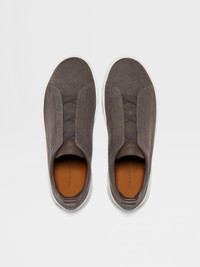 A Zegna icon reimagined: these dark taupe Triple Stitch™ sneakers are crafted from cotton, linen and leather. INFO A breezy take on Zegna's emblematic shoe, these dark taupe Triple Stitch™ sneakers are crafted from a charming cotton and linen blend. Their iconic silhouette is lined in sleek Foliage-colored leather and supported by a fresh white rubber sole, secured with the design's signature triple-crossed elastics. The Triple Stitch™ Shoes are an icon of ZEGNA's contemporary wardrobe offering. Hallmarked with a namesake trio of crosses — inspired by the handmade stitches found on our tailoring — the comfortable slip-on style is available in an array of refined materials and set on a lightweight, flexible sole. PRODUCT CODE LHLNA-S7981Z-FGG MATERIALS AND CARE Cotton; Linen; Calf Leather Clean with a soft cloth. Avoid contact with abrasives, water and substances containing alcohol, such as perfumes, solvents, etc. In case of contact with water, it is important to let the footwear dry completely before cleaning. Clean the rubber soles with a product specifically designed for cleaning rubber. Store in the included dust bag in a cool, dry place. To preserve the quality of your Triple Stitch™, we recommend using our exclusive Care Kit. FIT AND PRODUCT DETAILS • Crossed elastics • Foliage-colored leather lining • Sanitized® removable footbed • White rubber sole • Zegna 232 Road Brand Mark on the heel tab • Made in Italy • Comes with a shoe bag We want every pair of Triple Stitch™ sneakers to fit perfectly anytime, anywhere, anyplace. To find your perfect fit, we recommend going down a half-size compared to your usual shoe size. Please note that Zegna uses UK sizing. For further information, please contact us via our customer service channels or by visiting the nearest Zegna flagship store.
