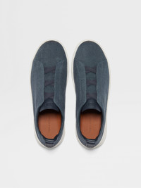 A Zegna icon reimagined: these dark teal blue Triple Stitch™ sneakers are crafted from cotton, linen and leather. INFO A breezy take on Zegna's emblematic shoe, these dark teal blue Triple Stitch™ sneakers are crafted from a charming cotton and linen blend. Their iconic silhouette is lined in sleek Foliage-colored leather and supported by a fresh white rubber sole, secured with the design's signature triple-crossed elastics. The Triple Stitch™ Shoes are an icon of ZEGNA's contemporary wardrobe offering. Hallmarked with a namesake trio of crosses — inspired by the handmade stitches found on our tailoring — the comfortable slip-on style is available in an array of refined materials and set on a lightweight, flexible sole. PRODUCT CODE LHLNA-S7981Z-FDE MATERIALS AND CARE Cotton; Linen; Calf Leather Clean with a soft cloth. Avoid contact with abrasives, water and substances containing alcohol, such as perfumes, solvents, etc. In case of contact with water, it is important to let the footwear dry completely before cleaning. Clean the rubber soles with a product specifically designed for cleaning rubber. Store in the included dust bag in a cool, dry place. To preserve the quality of your Triple Stitch™, we recommend using our exclusive Care Kit. FIT AND PRODUCT DETAILS • Crossed elastics • Foliage-colored leather lining • Sanitized® removable footbed • White rubber sole • Zegna 232 Road Brand Mark on the heel tab • Made in Italy • Comes with a shoe bag We want every pair of Triple Stitch™ sneakers to fit perfectly anytime, anywhere, anyplace. To find your perfect fit, we recommend going down a half-size compared to your usual shoe size. Please note that Zegna uses UK sizing. For further information, please contact us via our customer service channels or by visiting the nearest Zegna flagship store.