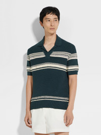 This dark teal blue, light yellow and white striped polo shirt is made from soft cotton-silk. INFO Slotting effortlessly into your everyday rotation, this refined polo shirt is jacquard-knitted from cotton and silk with a dark teal blue, light yellow and white striped pattern. A Cuban collar elevates the look with relaxed charm. PRODUCT CODE UFF85A9-C30-221 MATERIALS AND CARE 55% Cotton; 45% Mulberry Silk Do not wash. Do not bleach. Do not tumble dry. Iron at max 110°C. Professional dry cleaning in hydrocarbons, mild process. Wash and iron inside out. FIT AND PRODUCT DETAILS • 8 gauge • Cuban collar • Short sleeves • Ribbed hem and cuffs • Striped jacquard pattern