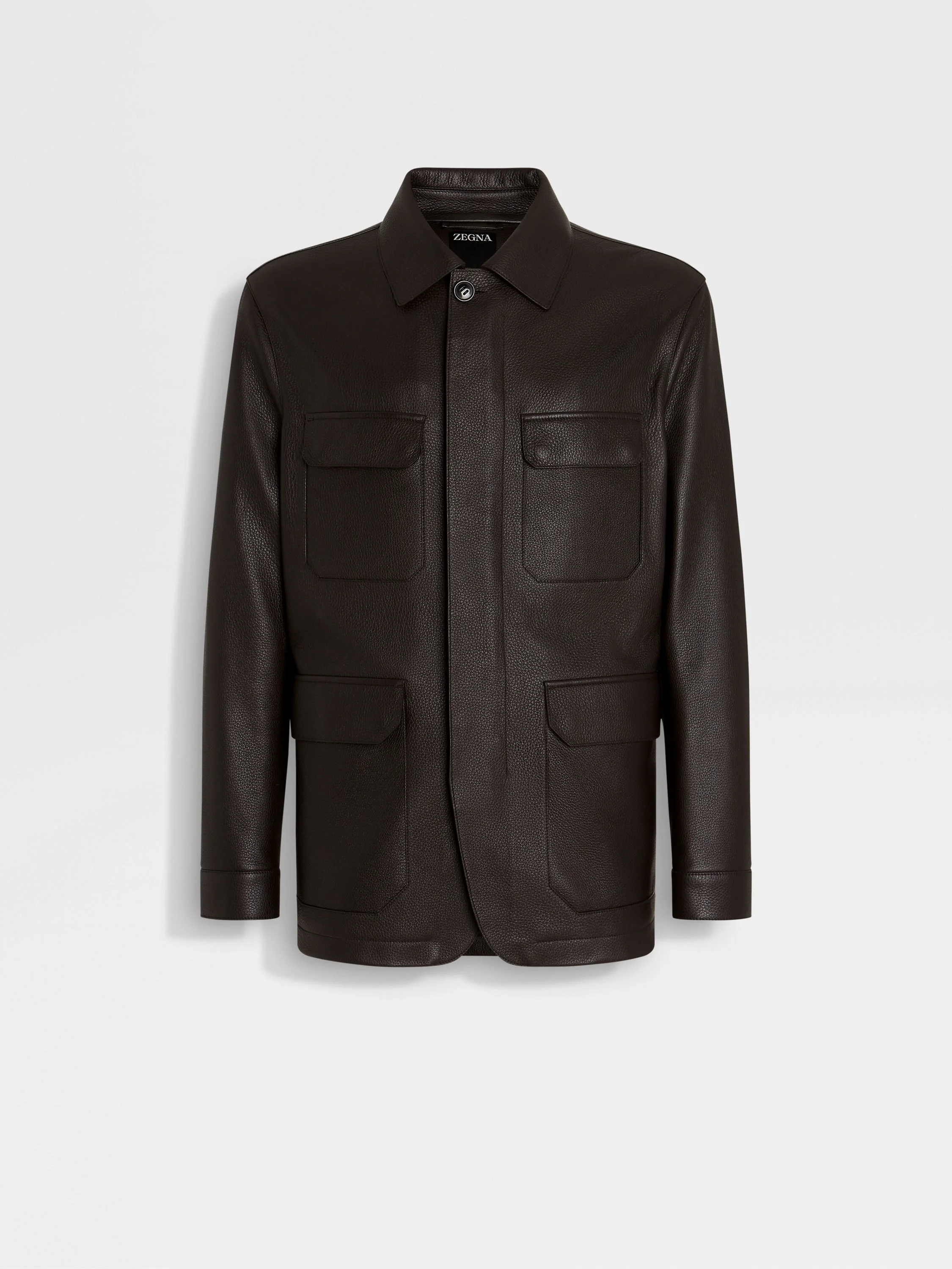Soft dark brown deerskin leather traces the utilitarian lines of this elegant field jacket. INFO Meticulous craftsmanship and impeccably soft leather elevate a casual straight-hem silhouette into a luxury icon. Lightly padded for warmth, this dark brown deerskin field jacket features a concealed placket for a streamlined aesthetic. A smart collar, patch pockets and shirt cuffs complete its elegant design. PRODUCT CODE UGPCEA2-G262-M09 MATERIALS AND CARE Main body: Deerskin Leather details: Calfskin Lining: 100% Wool Padding: 100% Polyester Do not wash. Do not bleach. Do not tumble dry. Iron at max 110°C. Professional dry cleaning in hydrocarbons, mild process. Protect the metal accessories during washing. Professional leather clean only. Use press cloth. FIT AND PRODUCT DETAILS • Regular fit • Shirt collar • Zip and button closure with concealed placket • Straight hem • Shirt cuffs • Leather details • Chest flap patch pocket • Lower flap patch pockets • Polyester padding • 76 cm length on size 48