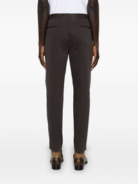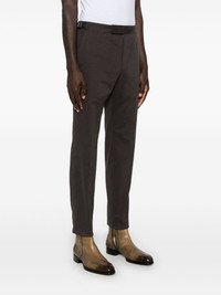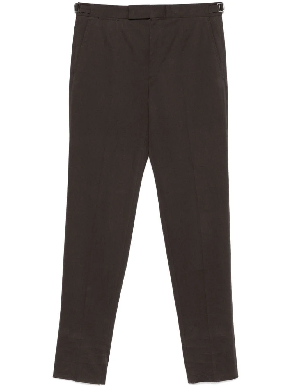 gabardine-weave trousers Highlights - Coffee brown - Cotton blend - Gabardine weave - Concealed front button, hook and zip fastening - Waist tabs - Front welt pocket - Two diagonal pockets to the sides - Pressed crease - Two rear jetted pockets - Slim cut Imported Composition Outer: Cotton 95%, Cashmere 4%, Elastane 1% Lining: Cotton 100% SIZE & FIT Model measurements Height 6 ft 2 in(1.87 m) Bust/Chest 36.41 in(92.5 cm) Hips 37 in(94 cm) Waist 29.52 in(75 cm) FittingInformation Designed for a slim tapered leg, offering a close fit that sits just away from the leg with a closer fit towards the ankle The adjustable tabs allow for fitted preferences Made from a midweight stretch fabric, this piece offers elasticity and flexibility when worn