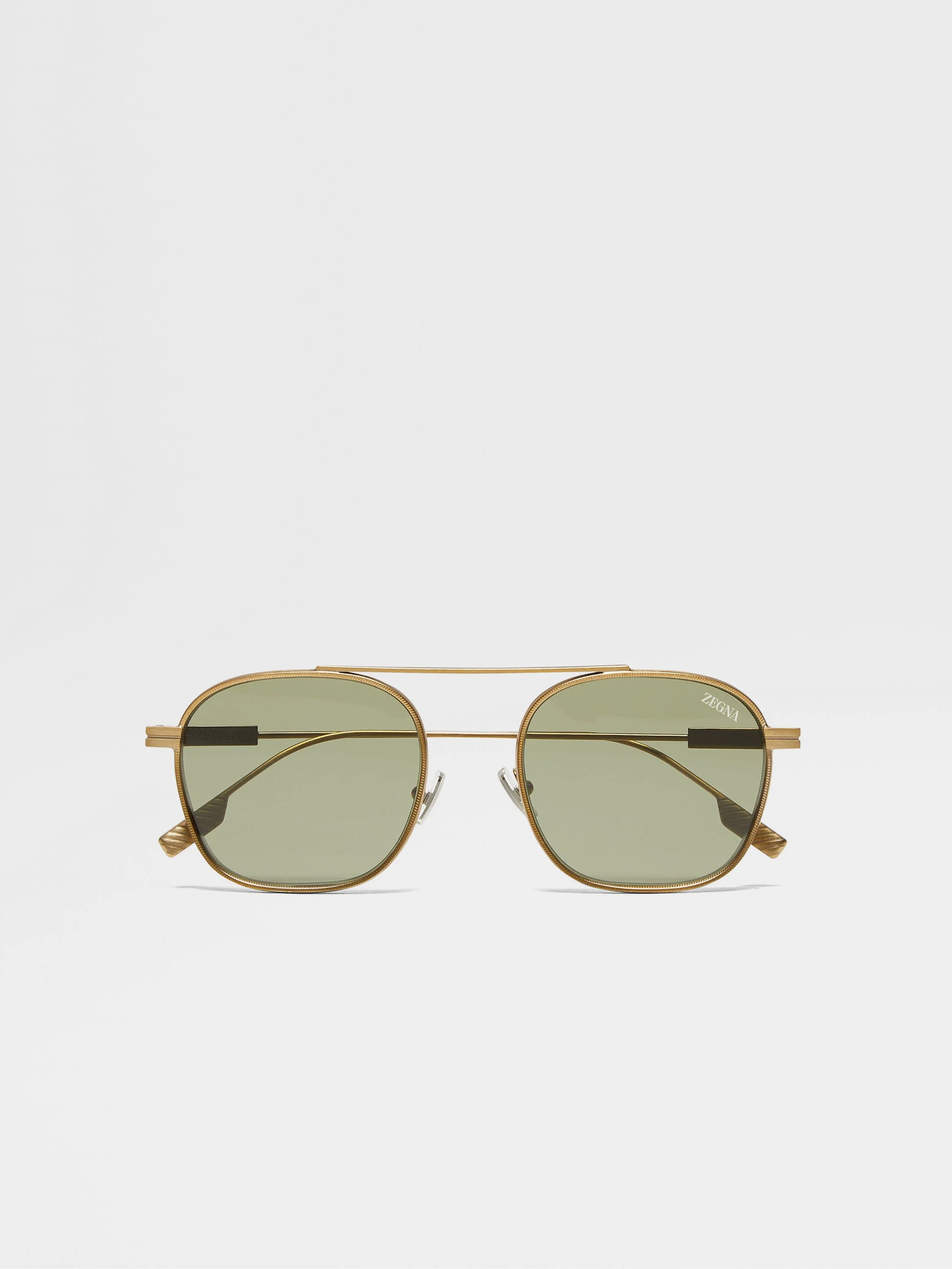 Make a statement in these gold Orizzonte I metal sunglasses. INFO These gold Orizzonte I sunglasses stand out with a high top-bar construction that seems to float on the face. A sleek full-metal design, this model is enriched with intricate embossed lines that bring depth and texture to the rims. Featuring our 232 Road Brand Mark on the temples for a signature touch, their soft round silhouette is elevated with adjustable palladium nosepads and high-grip paddle tips for enhanced comfort and functionality. A shiny deep gold internal rim outline and green lenses add a refined contrast and complete the look. ORIZZONTE (oridˈdzonte) – ITALIAN FOR 'HORIZON' The inspiration for the Orizzonte I sunglasses was born in Oasi Zegna, the home of ZEGNA’s values in the Italian Alps. Its contemporary and casual bridgeless silhouette is embellished with the iconic 232 Road Brand Mark and the ZEGNA logo. The geometric shape is characterised by the special construction, featuring a high metal top bar that inspired the name ‘Orizzonte’. PRODUCT CODE EZ0290-5335N MATERIALS AND CARE Full Metal Clean your eyewear using a soft cloth, preferably microfiber, with water or a mild detergent. To avoid scratching the lenses, never use paper towels or clothing to clean your eyewear. Do not use household detergents or soaps to clean your eyewear; these products will damage the lenses over time. FIT AND PRODUCT DETAILS • Lens 53 mm – Bridge 21 mm – Temple 145 mm • Base 2 • Finishing: matte • Not suitable for mounting prescription lenses • Single bridge • Green lenses • Grip paddle on the end of the temples • Adjustable palladium nosepads • ZEGNA 232 Road Brand Mark on the temples as a corner detail • ZEGNA Logo on the lens and on the inner side of the temples