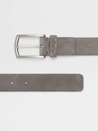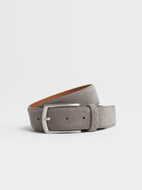 This free-sized dark grey suede belt guarantees optimal comfort, while nodding to the Brand's modern tailored aesthetic. INFO The rich textures of the Luxury Leisurewear belt collection will elevate informal looks with refined materials and elegant metal finishes. The most versatile style of the line, this dark grey suede leather belt with Vicuna-colored nubuck lining has a free-sized construction for maximum comfort. Its slightly squared silver-tone metal buckle adds a finishing touch. PRODUCT CODE BCAS1A-J4350B-PIO MATERIALS AND CARE Suede; nubuck FIT AND PRODUCT DETAILS • Metal buckle with silver-tone finish • Width: 3.2 cm / 1.2 in • Adjustable free-sized belt • Dark grey suede • Vicuna-colored nubuck lining • Made in Italy