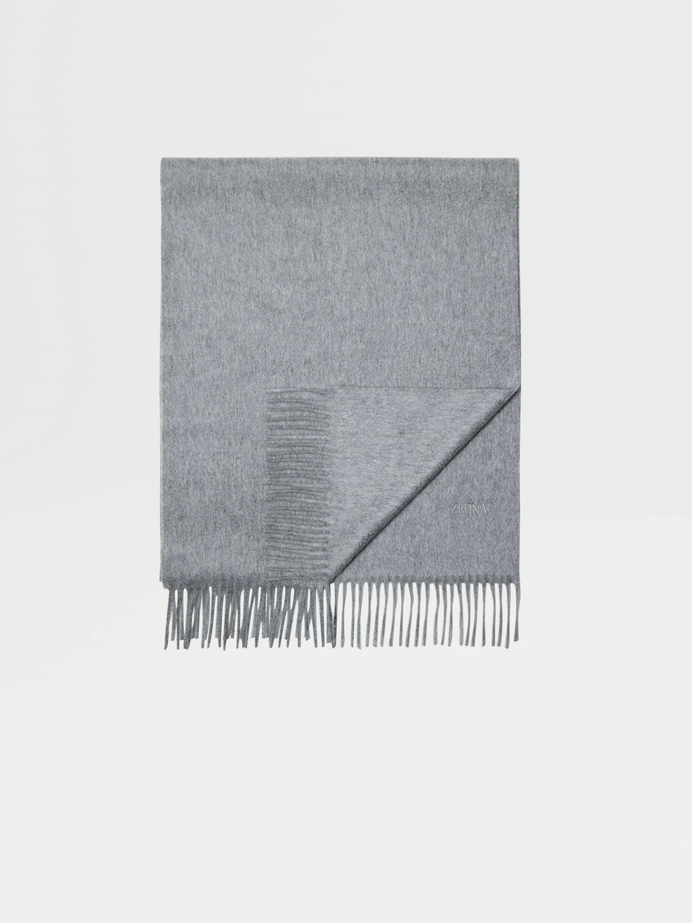 The grey Oasi Cashmere scarf is finished off with long fringes. INFO Enjoy Zegna's uncompromising quality standards throughout the seasons: the grey Oasi Cashmere scarf blocks out the cold thanks to one of the brand's softest and most exclusive materials. This lush cashmere scarf is presented in a solid colorway and trimmed with fringed borders. It is signed off with the tonal leather Zegna 232 Road Brand Mark. PRODUCT CODE E7L41SA8-26N-GR2 MATERIALS AND CARE 100% Cashmere The inspiration behind this Oasi Cashmere Collection garment was Born in Oasi Zegna, our 100km² natural territory and the home of our values. It's crafted from Oasi Cashmere fibres, which ZEGNA commits to certifying as traceable from 2024. The Oasi Cashmere Collection follows in the footsteps of our founder, who envisioned a vertically integrated system of producing textiles. Do not wash. Do not bleach. Do not tumble dry. Do not iron. Professional dry cleaning in tetrachloroethene and hydrocarbons, mild process. FIT AND PRODUCT DETAILS • Size: 180 x 36 cm / 70.9 x 14.2 in • Long fringes • Tonal leather Zegna 232 Road Brand Mark • Oasi Cashmere label • Made in Italy