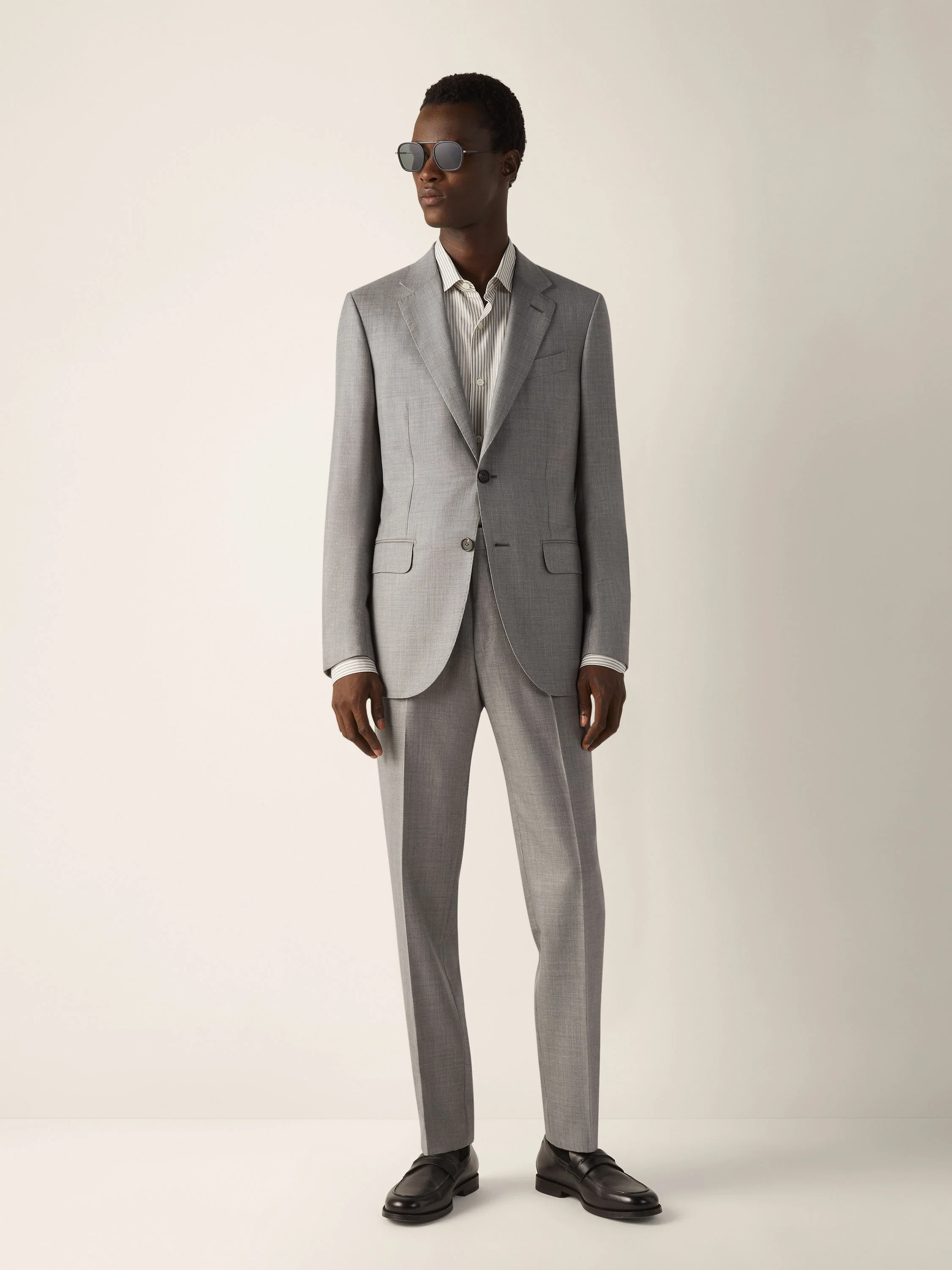 Rediscover the luxurious allure of pure cashmere in this grey Oasi Cashmere suit. INFO This grey suit is crafted from fine Oasi Cashmere: an exclusive fabric spun from meticulously selected fibers in honor of ZEGNA's commitment to traceability. Notch lapels, double vents and flap pockets complete the look with timeless sartorial sophistication. PRODUCT CODE 329516A3-21L2N5 MATERIALS AND CARE 100% Cashmere The inspiration behind this Oasi Cashmere collection garment was born in Oasi Zegna, a 100km² natural territory and the home of our values. It's crafted from Oasi Cashmere fibres, made with 100% certified traceable fibres. The Oasi Cashmere collection follows in the footsteps of our Founder, who envisioned a vertically integrated system of producing textiles. Do not wash. Do not bleach. Do not tumble dry. Iron at max 110°C. Professional dry cleaning in tetrachloroethene and hydrocarbons, mild process. FIT AND PRODUCT DETAILS • Regular fit • Drop 7 • Tailoring suit • Double vent • Notch lapel • Button closure • Flap pockets • Canvas construction • Lined • 75 cm length on size 48 • 20 cm hem • Flat front pants Sleeves and pants are unfinished. You can bring your jacket and pants to our boutiques for alterations.