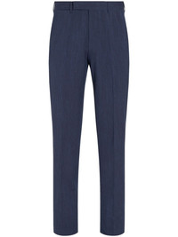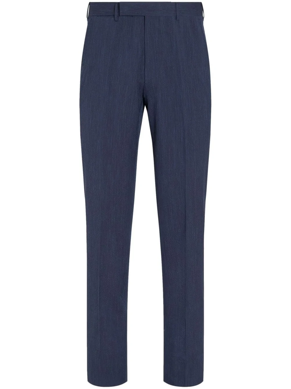 high-waist slim-fit trousers Highlights - Navy blue - Wool-silk blend - Seersucker texture - Pinstripe pattern - Belt loops - Pressed crease - Two side slit pockets - Two rear button-fastening jetted pockets - Slim cut - Concealed front button, hook and zip fastening Imported Composition Wool 75%, Mulberry Silk 13%, Linen/Flax 8%, Elastane 4%