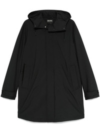 hooded raincoat Highlights - Black - Matte finish - Concealed front zip fastening - Concealed front press-stud fastening - Detachable drawstring hood - Classic collar - Long sleeves - Touch-strap cuffs - Two side zip-fastening pockets - American rear vent - Full lining - Straight hem Imported Composition Outer: Polyester 100% Lining: Polyester 100%