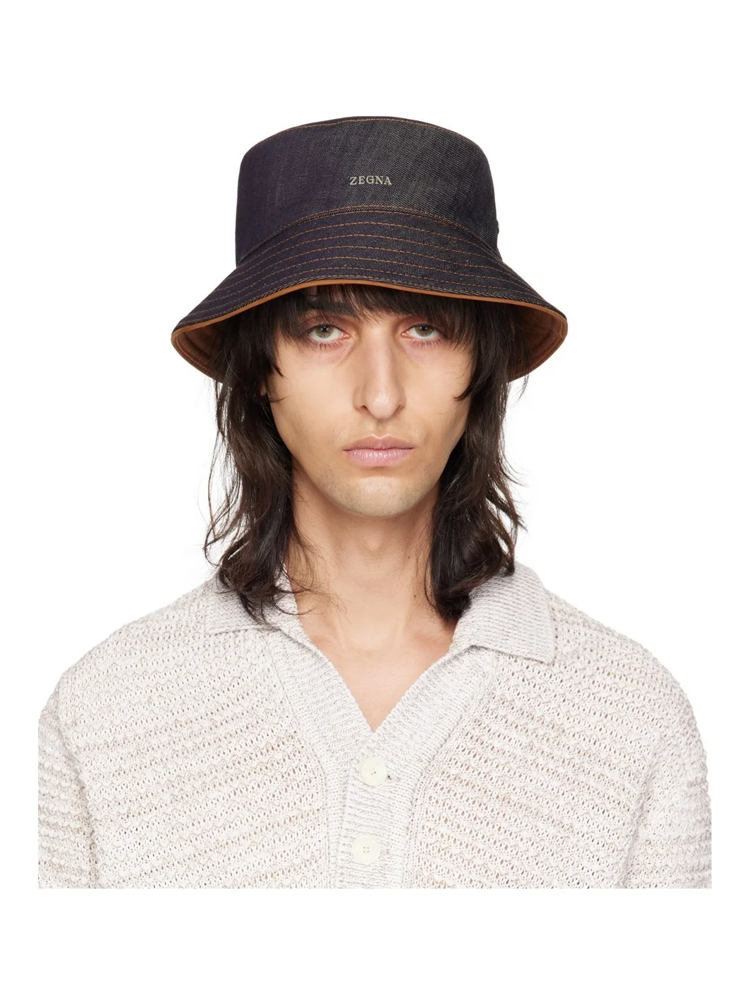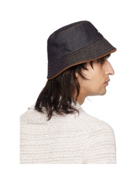 Non-stretch denim bucket hat in indigo. · Quilted brim · Logo hardware at side · Logo flag at back face · Grosgrain browband · Contrast stitching in orange Supplier color: Blue 58% cotton, 42% linen. Made in Italy 241142M140002