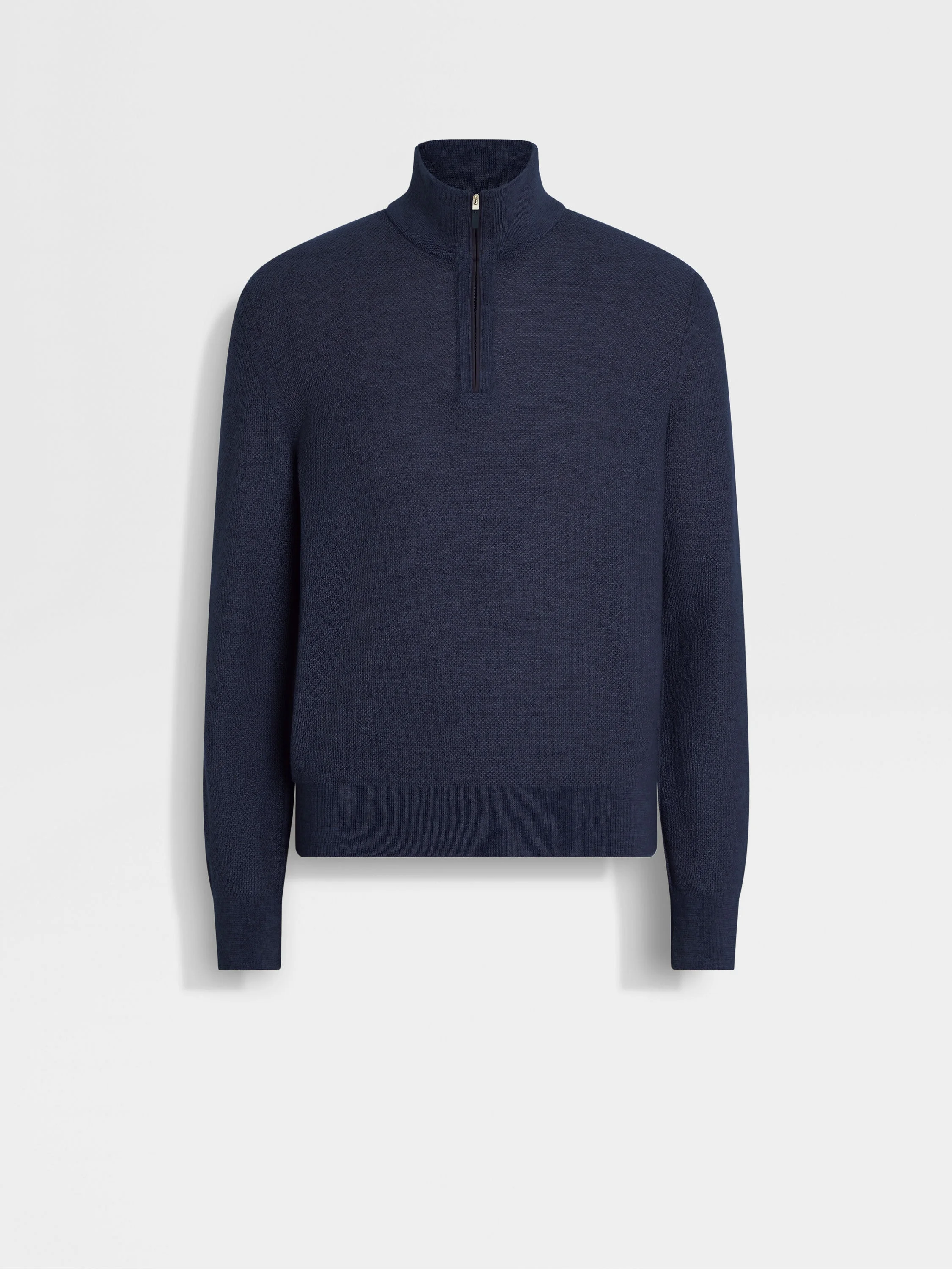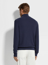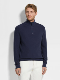 This ink blue Oasi Cashmere zip mock-neck sweater is knit from one of ZEGNA's most exclusive fibers. INFO This ink blue sweater elevates a snug mock-neck silhouette with the natural allure of ZEGNA's Oasi Cashmere fibers. A zip closure ensures endless versatility, enriched with sleek leather details. PRODUCT CODE UGK93A2-127-B06 MATERIALS AND CARE Main body: 100% Cashmere Leather details: Calfskin The inspiration behind this Oasi Cashmere collection garment was born in Oasi Zegna, a 100km² natural territory and the home of our values. It's crafted from Oasi Cashmere fibres, made with 100% certified traceable fibres. The Oasi Cashmere collection follows in the footsteps of our Founder, who envisioned a vertically integrated system of producing textiles. Do not wash. Do not bleach. Do not tumble dry. Iron at max 110°C. Professional dry cleaning in hydrocarbons, mild process. Wash and iron inside out. FIT AND PRODUCT DETAILS • Regular fit • 18 gauge • Ribbed high neck collar • Long sleeves • Ribbed hem and cuffs • Zip closure • Leather details on placket