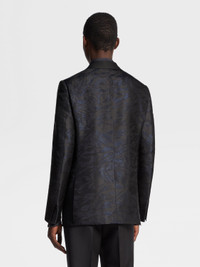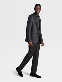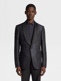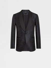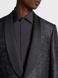 Make an entrance with the black jacquard silk tailoring evening jacket. INFO The black jacquard silk tailoring evening jacket showcases the full potential of pure mulberry silk. This refined natural material's unmistakable finish adds a brilliant quality to the discreet jacquard pattern. Draped, shawl lapels complete the sophisticated look. PRODUCT CODE 615E02A6-11EXN0 MATERIALS AND CARE 100% Mulberry Silk Do not wash. Do not bleach. Do not tumble dry. Iron at max 110°C. Professional dry cleaning in tetrachloroethene and hydrocarbons, mild process. FIT AND PRODUCT DETAILS • Regular fit • Drop 7 • Tailoring jacket • Double vents • Shawl lapels • Jacquard pattern • Button closure • Welt pockets • Canvas construction • Lined • 74 cm length on size 48 • Model is 186 cm tall (6.1 feet) and wears an Italian size 48.