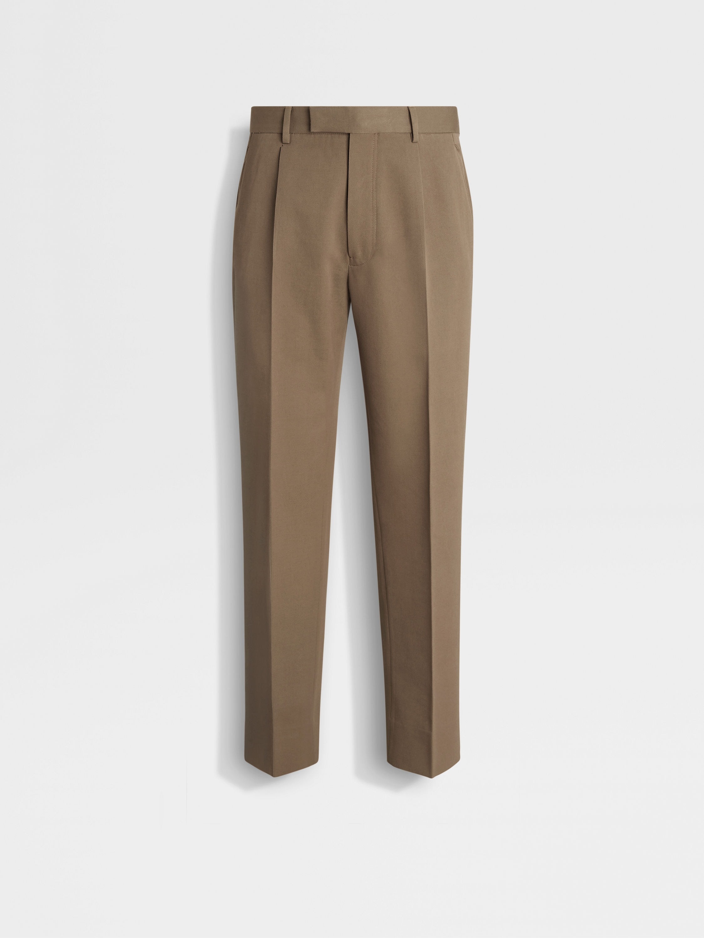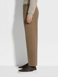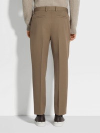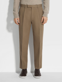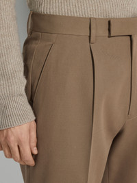 The khaki cotton and wool pants are a sophisticated everyday staple. INFO Styled with a crisp pleat in the front, the khaki cotton and wool pants are made from a lightweight blend of natural materials. Soft and breathable, they hold their shape throughout busy days. The pants have slanted pockets and a welt pocket on the back. PRODUCT CODE UEI04A8-TP45-V04 MATERIALS AND CARE Main body: 57% Cotton; 43% Wool Lining: 100% Cotton Do not wash. Do not bleach. Do not tumble dry. Iron at max 110°C. Professional dry cleaning in hydrocarbons, mild process. Wash inside out. FIT AND PRODUCT DETAILS • Pleated fit • 19.5 open hem • Zip and button closure • Slanted pockets and back welt pocket