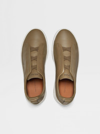 The khaki Triple Stitch™ SECONDSKIN sneakers perfectly mold to your foot. INFO The khaki Triple Stitch™ SECONDSKIN sneakers are crafted from specially selected calf leather for even more flexibility. The brand’s signature triple-crossed elastic detail ensures an easy slip-on fit, while evoking the traditional hand-stitching of tailored jackets to symbolize and honor Zegna’s legacy of fine craftsmanship. The super soft, light uppers are complemented by a white rubber sole. The Triple Stitch™ SECONDSKIN Shoes result from over a century of generational craftsmanship, the sharing of wisdom and dedication to innovation. Crafted from our SECONDSKIN leather, they feature a remarkable 'memory' that ensures a glove-inspired fit — making them ideal for travelling in exceptional style and comfort. PRODUCT CODE LHOTA-S5207Z-MUD MATERIALS AND CARE Calf Leather SECONDSKIN is crafted by tanneries selected for their renowned expertise. Fine, supple and incredibly soft to the touch, it moulds to your proportions over time — offering impeccable comfort with each wear. Clean with a soft cloth. Avoid contact with abrasives, water and substances containing alcohol, such as perfumes, solvents, etc. In case of contact with water, it is important to let the footwear dry completely before cleaning. Clean the rubber soles with a product specifically designed for cleaning rubber. Store in the included dust bag in a cool, dry place. FIT AND PRODUCT DETAILS • Crossed elastics • Tonal leather lining • Sanitized® removable footbed • White rubber sole • Zegna 232 Road Brand Mark on the heel tab • Made in Italy • Comes with a shoe bag We want every pair of Triple Stitch™ sneakers to fit perfectly anytime, anywhere, anyplace. To find your perfect fit, we recommend going down a half-size compared to your usual shoe size. Please note that Zegna uses UK sizing. For further information, please contact us via our customer service channels or by visiting the nearest Zegna flagship store.