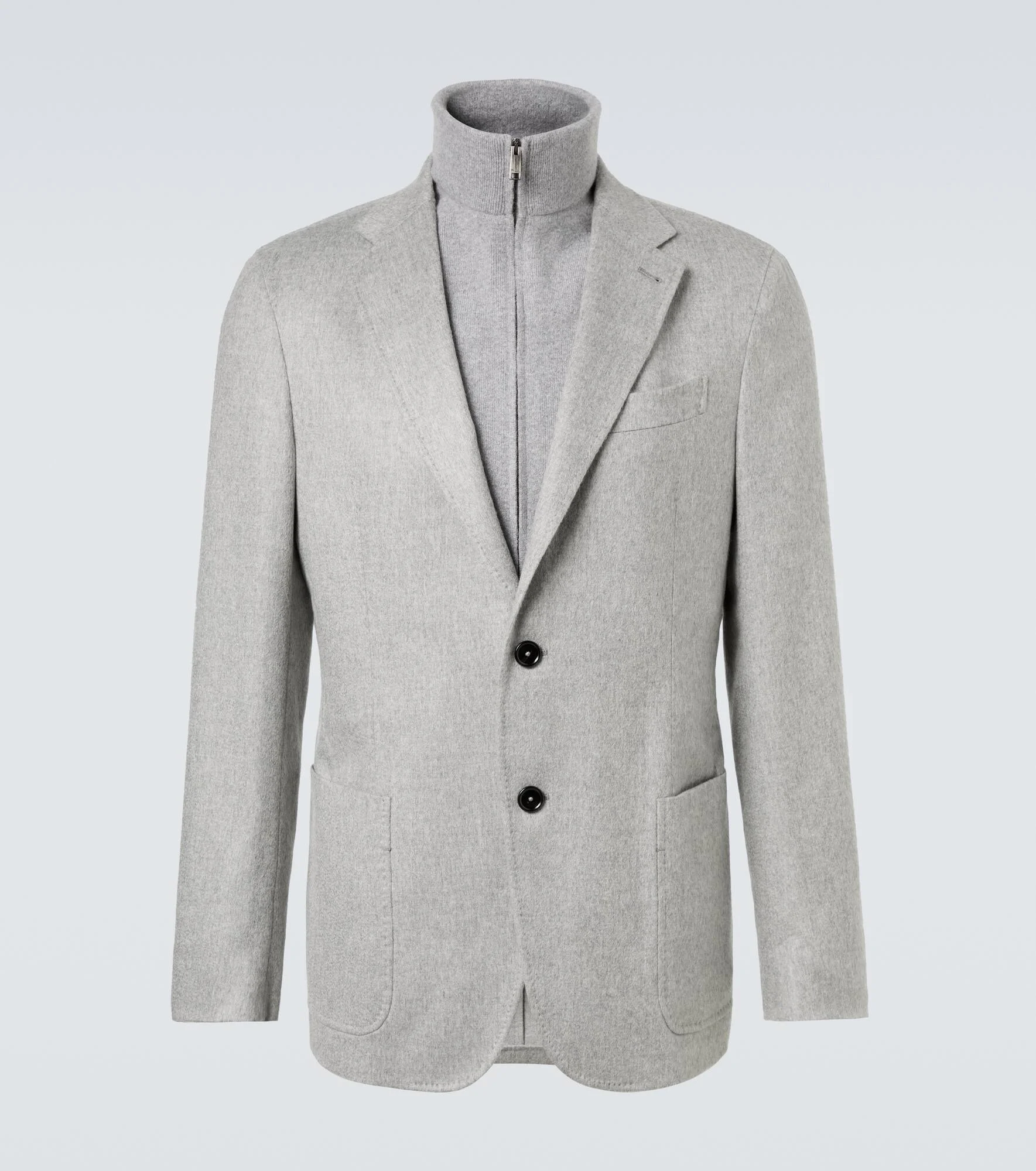 Zegna is now the go-to brand for luxurious and innovative menswear, and this blazer proves it. Made from pure cashmere, the design features classic notched lapels, a detachable zip-up bib, and spacious patch pockets. Product Details - Material: 100% cashmere - Care instructions: dry clean - Made in Italy - Designer color name: Grey Melange - Item color: gray - Sleeve lining: 100% cupro - Details: 100% calf leather - Contains non-textile parts of animal origin - Notched lapel - Collar: turtleneck - Pockets: patch pockets, angled chest pocket, internal pockets - Closure: two-way zipped front, buttoned front - Cuff: buttoned - Vent: double - Item number: P01057449 Size & Fit - Fits small to size - we recommend trying one size larger - Straight fit - Non-stretchy fabric - Falls below the hip - slit length 20cm-8" - The model in the picture is 185cm-6'1" and wearing a size IT 52