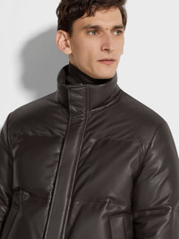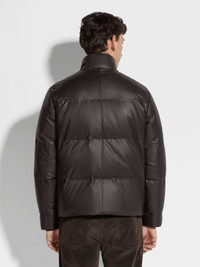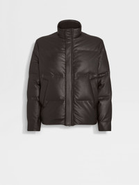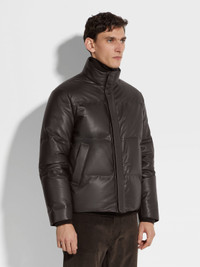 The dark brown nappa leather blouson transforms any casual look with a refined choice of materials. INFO Made from pure calfskin nappa, the dark brown leather blouson has a beautiful natural texture. The jacket fastens with a zip and snaps and is topped off with a stand collar. Goose down and feather padding offers an extra layer of warmth. PRODUCT CODE UEPNPA8-E188-M09 MATERIALS AND CARE Main body: Calfskin Nappa Leather details: Calfskin Lining: 89% Wool; 6% Mulberry Silk; 5% Cashmere Padding: 90% Goose Down; 10% Feathers Do not wash. Do not bleach. Do not tumble dry. Iron at max 110°C. Professional dry cleaning in hydrocarbons, mild process. Protect the metal accessories during washing. Professional leather clean only. FIT AND PRODUCT DETAILS • Regular fit • Stand collar • Zip and snap button closure • Adjustable hem • Windproof cuffs • Side stand pockets • Thermoglued down sector • Goose down and feather padding • 70 cm length on size 48