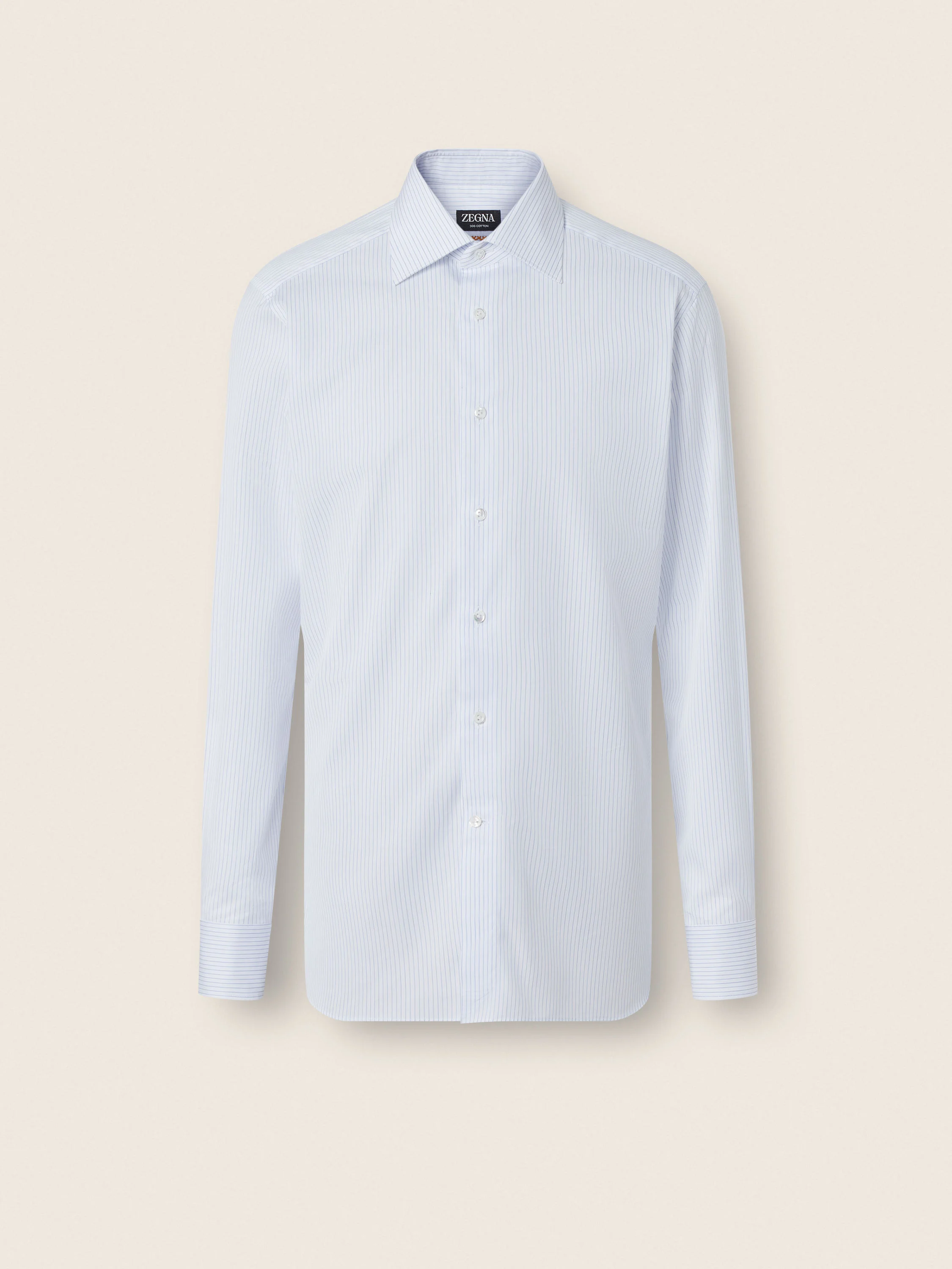 This long-sleeve shirt is made from ZEGNA's 300 Cotton with a light avio blue and white striped pattern. INFO With its luxurious texture and charming striped pattern, this light avio blue and white 300 Cotton shirt is an elevated essential for formal ensembles. Its regular long-sleeve silhouette is edged with a smart pointed collar and standard cuffs. PRODUCT CODE 302081A3-9NS0PR MATERIALS AND CARE 100% Cotton Max washing temp 40°C. Do not bleach. Do not tumble dry. Iron at max 150°C. Professional dry cleaning in tetrachloroethene and hydrocarbons. FIT AND PRODUCT DETAILS • Regular fit • Tailoring shirt • Pointed collar • Rounded hem • Standard cuffs • Button closure • Striped pattern • 79 cm length on size 39