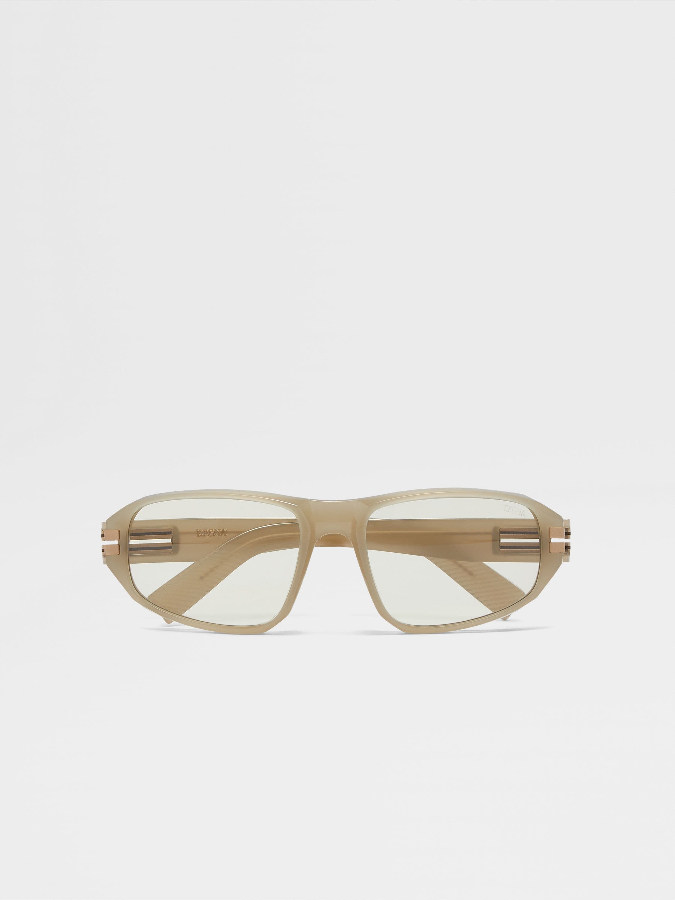 The light beige acetate sunglasses are accented with metalic inserts at the corners. INFO A shiny finish adds an extra touch of style to the light beige acetate sunglasses' rectangular frame. The thicker sides and temples highlight the sturdy material, while the single bridge keeps the look streamlined. The iconic, metal Zegna 232 Road Brand Mark accentuates the temples, and the temple tips are fitted with details to ensure they stay in place. The sunglasses come with a matching linen lanyard, which fastens with a leather closure. PRODUCT CODE EZ0262-5857J MATERIALS AND CARE Full Acetate Clean your eyewear using a soft cloth, preferably microfiber, with water or a mild detergent. To avoid scratching the lenses, never use paper towels or clothing to clean your eyewear. Do not use household detergents or soaps to clean your eyewear; these products will damage the lenses over time. FIT AND PRODUCT DETAILS • Finishing: shiny • Not suitable for mounting prescription lenses • Single bridge • Matching linen lanyard with leather closure • Zegna Logo on the lens • Parallel line details on the temple tips for optimal grip • Metal Zegna 232 Road Brand Mark on the corners of the temples