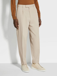 The light beige cotton and wool pants feature a single pleat down the front. INFO The light beige cotton and wool pants are a staple in any wardrobe. Easy to dress up or down, the pants pair lightweight fabric with a classic, pleated fit. They are styled with slanted pockets in the front and welt pockets on the back. Customize this item with our Made to Measure Service. For more information, please contact our Customer Care or visit your nearest stores. PRODUCT CODE UDI04A7-TP45-N03 MATERIALS AND CARE Main body: 57% Cotton; 43% Wool Lining: 100% Cotton Do not wash. Do not bleach. Do not tumble dry. Iron at max 110°C. Professional dry cleaning in hydrocarbons, mild process. Wash inside out. FIT AND PRODUCT DETAILS • Pleated fit • 19.5 cm open hem • One pleat front style • Zip and button closure • Slanted pockets • Back welt pockets • Model is 187 cm tall (6.1 feet) and wears an Italian size 48.