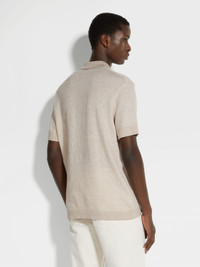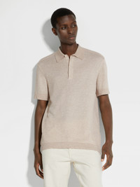 The light beige cotton, linen, and silk polo shirt features a refined, jacquard weave. INFO Made from three prized natural fibers, the light beige cotton, linen, and silk polo shirt is lightweight, breathable, and resilient. This elevated, short-sleeve polo shirt is styled with a hidden button placket to keep the look sleek and streamlined. A classic knit polo collar and matching trim frame the distinctive fabric. PRODUCT CODE UD372A7-D727-N03 MATERIALS AND CARE 43% Cotton; 42% Linen; 15% Mulberry Silk Do not bleach. Do not tumble dry. Iron at max 110°C. Professional dry cleaning in hydrocarbons. Wash and iron inside out. FIT AND PRODUCT DETAILS • Jacquard weave • Short sleeves • Knit polo collar • Knit hem and cuffs • Concealed button closure • Regular fit • Model is 185 cm tall (6.0 feet) and wears an international size M.