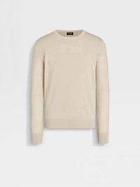 The light beige mélange Cashseta crewneck brings together cashmere and silk. INFO Zegna's refined blend of cashmere and silk lends the light beige mélange Cashseta crewneck its distinctive finish. The natural knit feels soft against the skin, elevating a simple design into a luxurious essential. The classic ribbed collar and trims complete the look. Customize this item with our Made to Measure Service. For more information, please contact our Customer Care or visit your nearest stores. PRODUCT CODE UDJ00A7-110-N93 MATERIALS AND CARE 70% Cashmere; 30% Mulberry Silk This sophisticated fabric combines the softness of cashmere with the smooth finish of fine silk. The yarns of Cashseta are dyed before the fabric is created, resulting in a mélange that is unique to each garment. Wash by hand. Do not bleach. Do not tumble dry. Iron at max 110°C. Professional dry cleaning in hydrocarbons, mild process. Wash and iron inside out. FIT AND PRODUCT DETAILS • 18 gauge • Ribbed crewneck collar • Long sleeves • Ribbed hem and cuffs • Regular fit • Model is 188 cm tall (6.2 feet) and wears an Italian size 48.