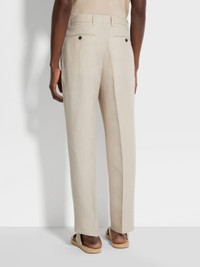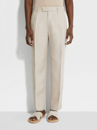 The light beige Oasi Lino pants are made from Zegna's 100% traceable, European-grown linen. INFO The light beige Oasi Lino pants exude timeless European charm thanks to the distinctive texture of pure linen. This natural material is soft, breathable, and key for creating elegant looks in warmer weather. The pleated linen pants have an elasticated drawstring waistband to ensure the perfect fit. PRODUCT CODE UDI18A7-TZ47-N03 MATERIALS AND CARE Main body: 100% Linen Lining: 100% Cotton The inspiration behind this Oasi Lino garment was Born in Oasi Zegna, our 100km² natural territory and the home of our values. Crafted exclusively from European-grown flax fibres that are certified as 100% traceable by 2024, Oasi Lino follows in the footsteps of our founder, who envisioned a vertically integrated system of producing textiles. Do not wash. Do not bleach. Do not tumble dry. Iron at max 110°C. Professional dry cleaning in hydrocarbons, mild process. Wash inside out. FIT AND PRODUCT DETAILS • Pleated fit • 19.5 cm open hem • Zip and button closure • Slanted pockets • Back welt pockets • One pleat style • Model is 187 cm tall (6.1 feet) and wears an Italian size 48.