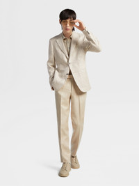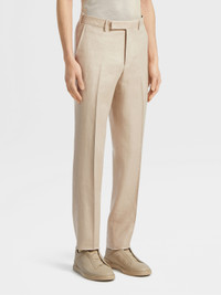 The light beige pure linen pants are styled with a contemporary, slim fit. INFO The natural texture of the light beige pure linen pants immediately sets them apart. Soft and breathable, pure linen has long been a staple of elegant formal wear. The updated fit elongates the legs for a dynamic look. PRODUCT CODE 573F04A5-75TB12 MATERIALS AND CARE 100% Linen Mild dry clean. Do not bleach. Do not tumble dry. Regular ironing, steam or dry, may be performed at low setting (110°C / 230°F). FIT AND PRODUCT DETAILS • Slim fit • 18.5 cm hem • Button and zip closure • American pockets • Unlined • Flat front canvas Pants hems are unfinished. You can bring your pants to our boutiques for alterations.