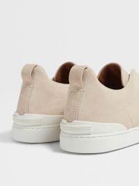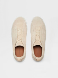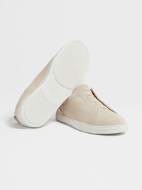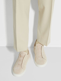 The light beige suede Triple Stitch™ sneakers feature a white rubber sole. INFO The light beige suede Triple Stitch™ low-top sneakers' construction makes them lightweight and flexible. The brand’s signature triple-crossed elastic detail ensures an easy slip-on fit, while evoking the traditional hand-stitching of tailored jackets to symbolize and honor Zegna’s legacy of fine craftsmanship. Foliage-colored leather lining completes the look. Customize these sneakers with our Made to Measure Service. For more information, please contact our Customer Care or visit your nearest stores. PRODUCT CODE LHSOY-S4667Z-UTA MATERIALS AND CARE Suede Clean with a brush designed for use with suede. Avoid contact with abrasives, water and substances containing alcohol, such as perfumes, solvents, etc. In case of contact with water, it is important to let the footwear dry completely before cleaning. Clean the rubber soles with a product specifically designed for cleaning rubber. Store in the included dust bag in a cool, dry place. FIT AND PRODUCT DETAILS • Crossed elastics • Foliage-colored leather lining • Extra-light white rubber sole • Sanitized® removable footbed • Made in Italy • Comes with a shoe bag We want every pair of Triple Stitch™ sneakers to fit perfectly anytime, anywhere, anyplace. To find your perfect fit, we recommend going down a half-size compared to your usual shoe size. Please note that Zegna uses UK sizing. For further information, please contact us via our customer service channels or by visiting the nearest Zegna flagship store.