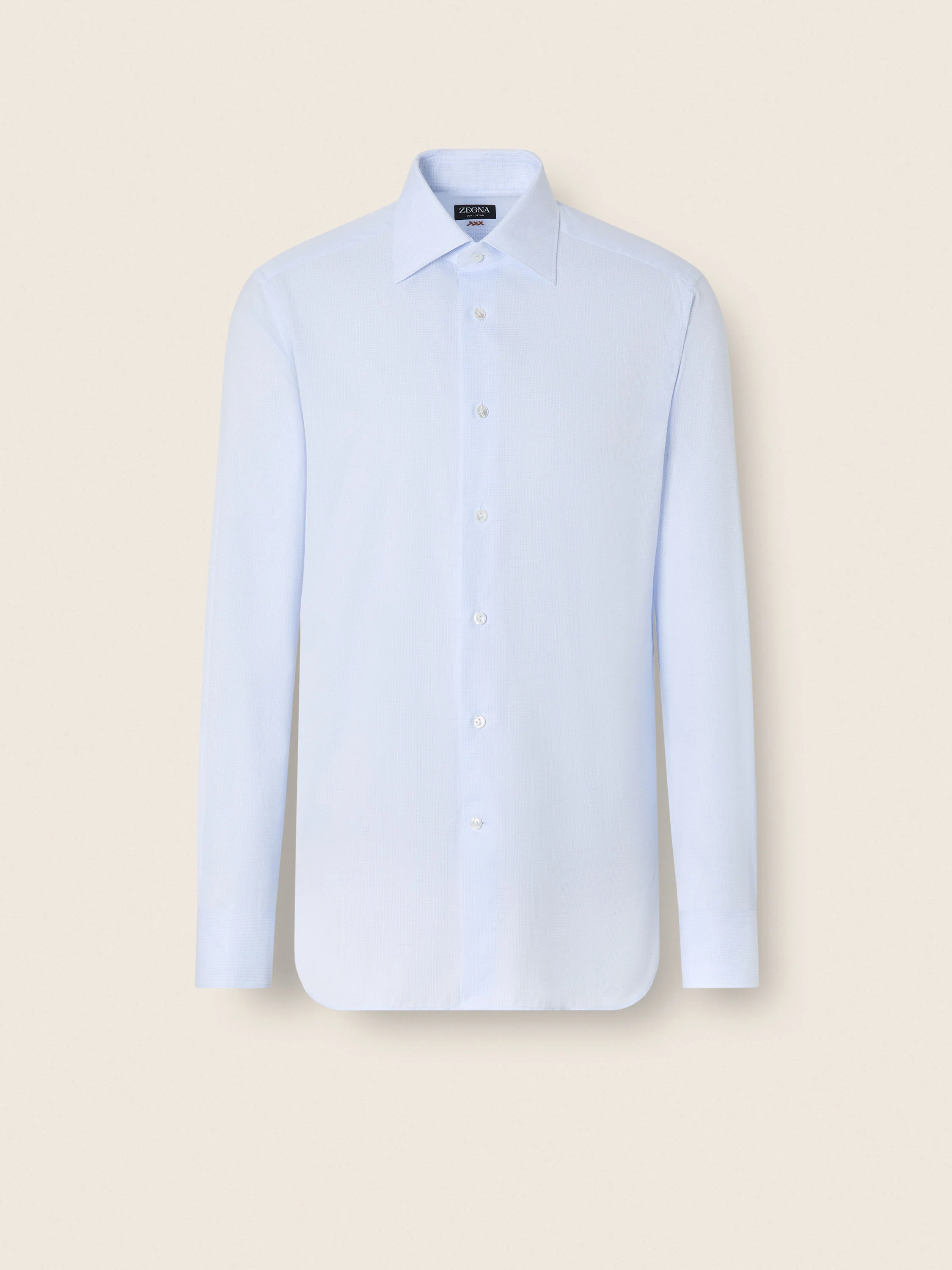 This long-sleeved shirt is made from ZEGNA's 300 Cotton with a light blue and white micro-checked pattern. INFO With its luxurious texture and charming light blue and white micro-checked pattern, this 300 Cotton long-sleeve shirt is a timeless essential for formal ensembles. Styled with a smart pointed collar and standard cuffs. PRODUCT CODE 302080A3-9NS0PR MATERIALS AND CARE 100% Cotton Max washing temp 40°C. Do not bleach. Do not tumble dry. Iron at max 150°C. Professional dry cleaning in tetrachloroethene and hydrocarbons. FIT AND PRODUCT DETAILS • Regular fit • Tailoring shirt • Pointed collar • Rounded hem • Standard cuffs • Button closure • Micro-checked pattern • 79 cm length on size 39