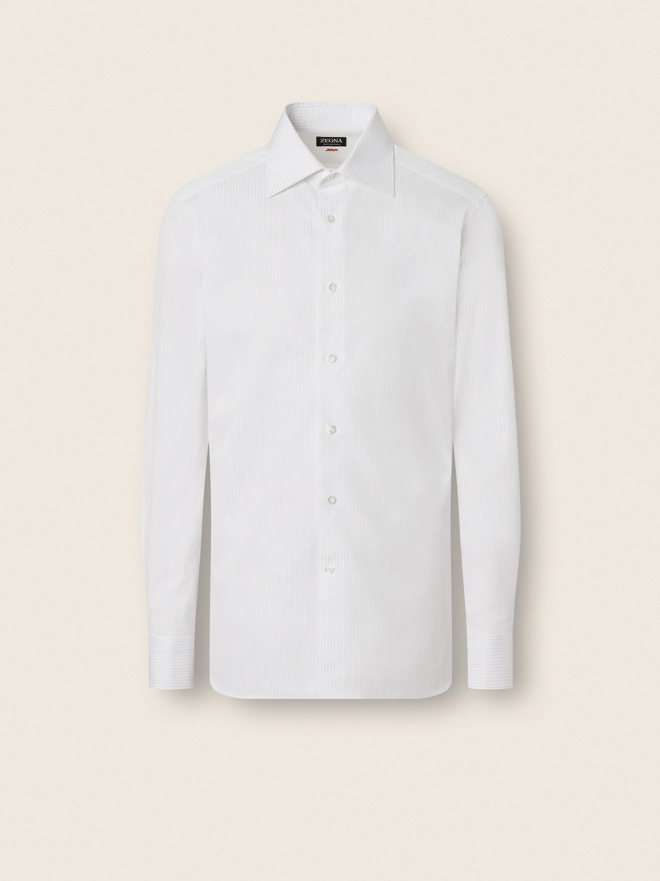 Silky soft with a light blue structured stripe: this Centoventimila cotton shirt is the epitome of tailored elegance. INFO A luxurious foundation for formal ensembles, this regular-fitting shirt is crafted from ZEGNA's exquisitely soft Centoventimila cotton. A structured light blue and white striped pattern and a traditional pointed collar cement its timeless allure. PRODUCT CODE 302017A3-9NS0PR MATERIALS AND CARE 100% Cotton Centoventimila – Italian for 120,000 – is named after its high thread count. Garments crafted from this fabric are extremely lightweight and have a soft, silk-inspired hand feel. Max washing temp 40°C. Do not bleach. Do not tumble dry. Iron at max 150°C. Professional dry cleaning in tetrachloroethene and hydrocarbons. FIT AND PRODUCT DETAILS • Regular fit • Tailoring shirt • Pointed collar • Rounded hem • Standard cuffs • Button closure • Structured striped pattern • 79 cm length on size 39