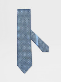 The light blue CENTO FILI silk tie's high thread count grants it a naturally luxurious finish. INFO The light blue CENTO FILI silk tie is embellished with a geometric jacquard pattern. Thanks to its exclusive material, this elegant accessory makes a sophisticated statement. PRODUCT CODE E8D41TA7-1PF-BL3 MATERIALS AND CARE Main body: 100% Mulberry Silk Lining: 67% Polyester; 33% Mulberry Silk Do not wash. Do not bleach. Do not tumble dry. Do not iron. Professional dry cleaning in tetrachloroethene and hydrocarbons, mild process. FIT AND PRODUCT DETAILS • Blade width: 8 cm / 3.1 in • Geometric jacquard pattern • Made in Italy