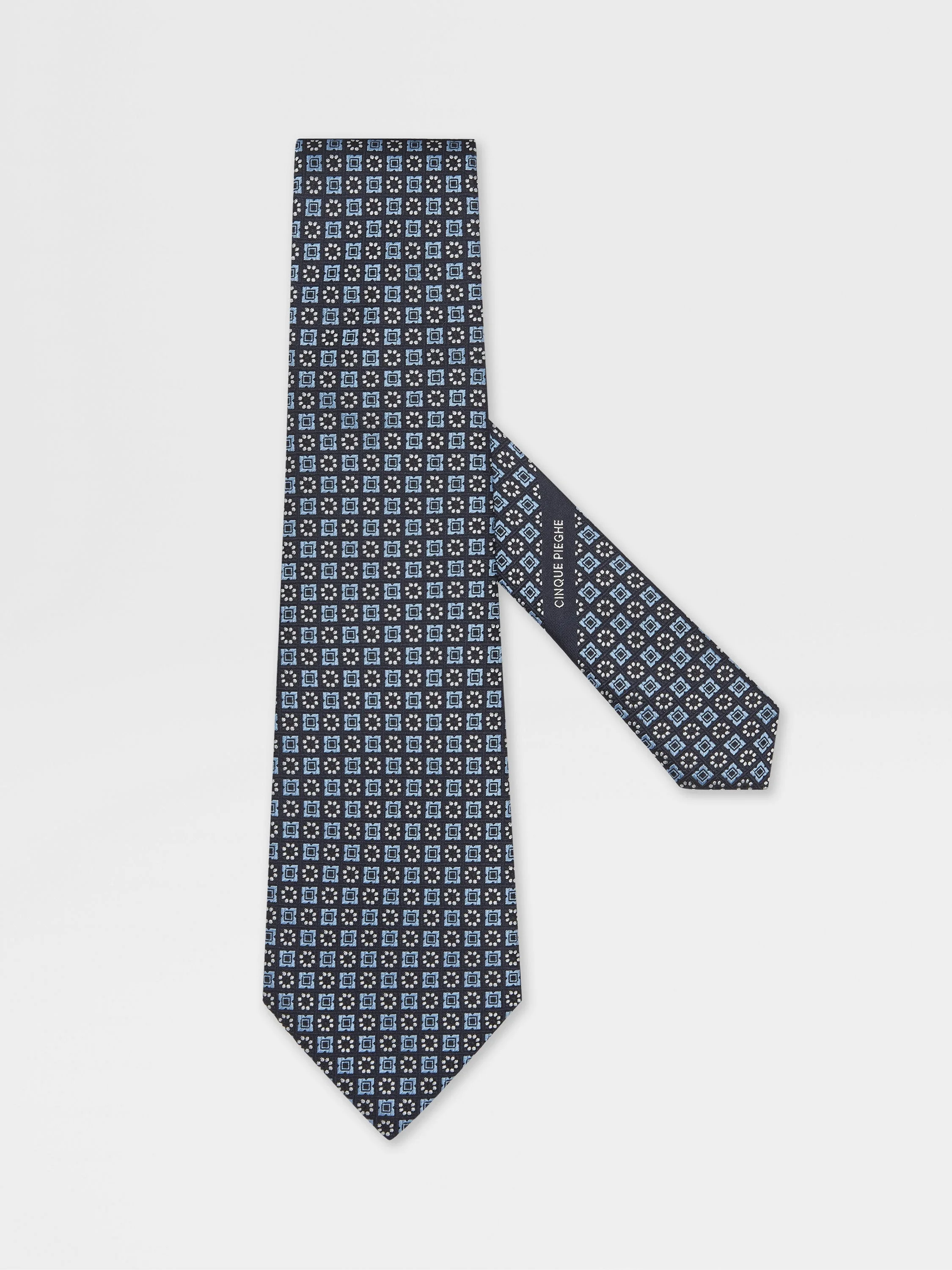 This light blue CINQUE PIEGHE silk tie showcases Zegna's iconic 5-fold construction. INFO The luxurious allure of this light blue CINQUE PIEGHE jacquard tie comes from its unique construction, crafted from pure mulberry silk that has been folded no less than five times. Designed with a geometric floral pattern to bring modern charm to evening ensembles. PRODUCT CODE Z9D12TA9-1P9-BL3 MATERIALS AND CARE Main body: 100% Mulberry Silk Lining: 100% Mulberry Silk Do not wash. Do not bleach. Do not tumble dry. Do not iron. Professional dry cleaning in tetrachloroethene and hydrocarbons, mild process. FIT AND PRODUCT DETAILS • Blade width: 8.8 cm / 3.4 in • Geometric floral jacquard pattern • Made in Italy