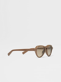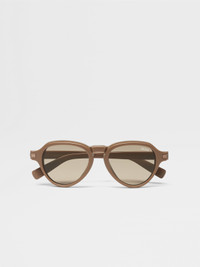 Featuring geometric forms and rounded volumes, the light brown acetate sunglasses play with light and shadow. INFO Boldly designed with a shiny finish, these light brown acetate sunglasses boast a single-bridge frame with pronounced, rounded volumes. Grip paddles at the temple tips improve the fit, while a striking Zegna 232 Road Brand Mark adorns the corners. The strong geometric shapes and distinct beveling create a visually impactful look, making these sunglasses a stylish, modern accessory. PRODUCT CODE EZ0252-5145E MATERIALS AND CARE Full Acetate Clean your eyewear using a soft cloth, preferably microfiber, with water or a mild detergent. To avoid scratching the lenses, never use paper towels or clothing to clean your eyewear. Do not use household detergents or soaps to clean your eyewear; these products will damage the lenses over time. FIT AND PRODUCT DETAILS • Lens 51 mm – Bridge 19 mm – Temple 145 mm • Base 2 • Finishing: shiny • Single bridge • Acetate end tips and rims • Medium bronze Zegna 232 Road Brand Mark on the temples as a corner detail • Chiseled lines on the temple tips