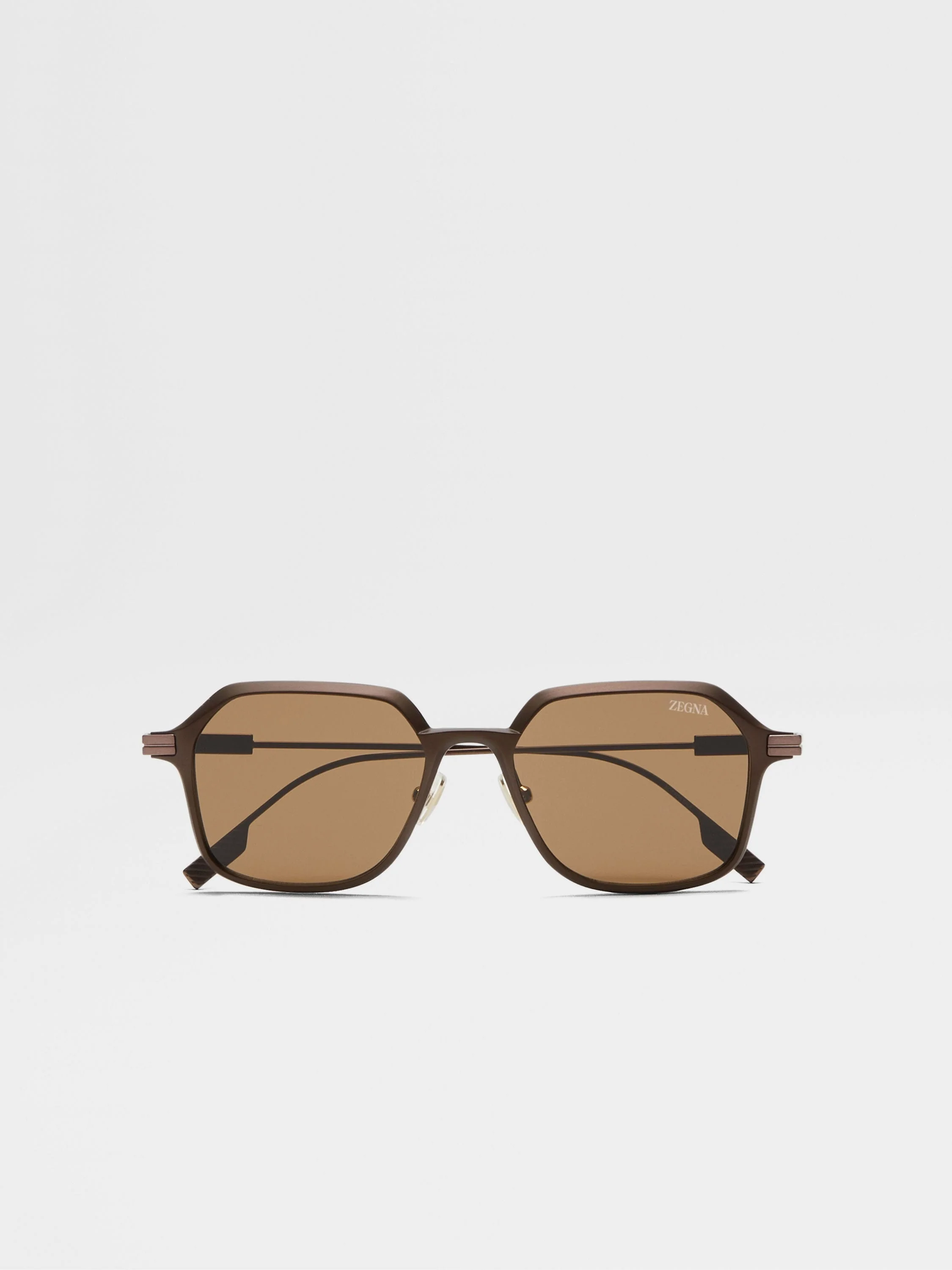 Crafted from light brown aluminum and metal, these sunglasses exude modern elegance with their sleek geometric silhouette. INFO Clean lines and meticulously crafted details: these light brown sunglasses are a masterpiece of modern elegance. Their geometric silhouette plays on the power of ultra-flexible aluminum to produce soft volumes and three-dimensional convex grooves, secured with adjustable nose pads and grip paddles on the temple tips. Our 232 Road Brand Mark enriches the design with an iconic Zegna touch. PRODUCT CODE EZ0274-5349E MATERIALS AND CARE Aluminum; Metal Clean your eyewear using a soft cloth, preferably microfiber, with water or a mild detergent. To avoid scratching the lenses, never use paper towels or clothing to clean your eyewear. Do not use household detergents or soaps to clean your eyewear; these products will damage the lenses over time. FIT AND PRODUCT DETAILS • Lens 53 mm – Bridge 18 mm – Temple 145 mm • Base 2 • Finishing: matte • Single bridge • Laser-inscribed Zegna Logo on the inside of the temple and on the lens • Zegna 232 Road Brand Mark on the temples