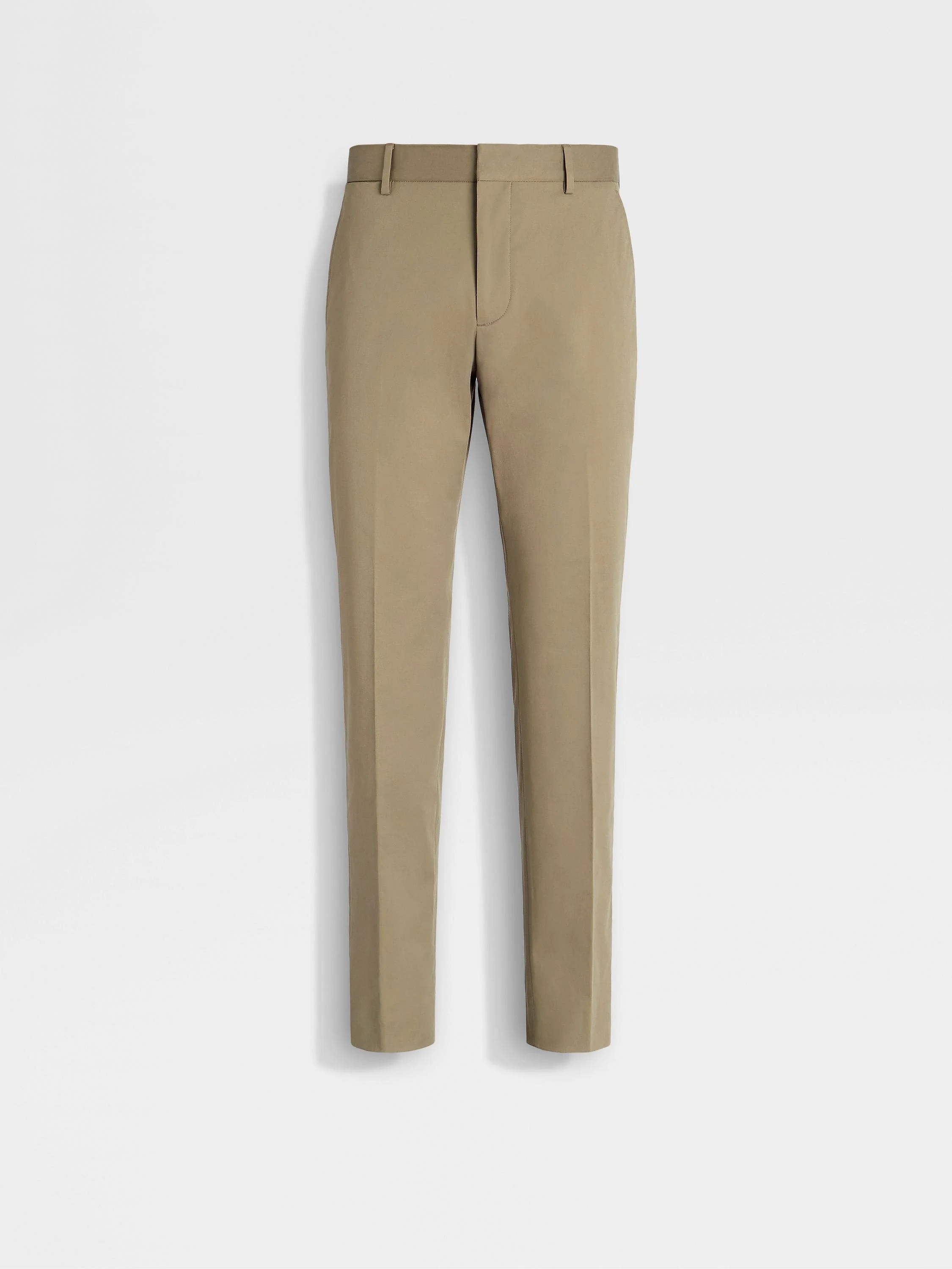 The light brown stretch cotton pants are essential for the new world of work. INFO Perfect for travel and relaxed enough for work-from-home, the light brown stretch cotton pants can easily be dressed up or down. The sleek flat front creates a flattering, streamlined silhouette, emphasizing their crisp lines. PRODUCT CODE E8I03-TR14-800 MATERIALS AND CARE Main body: 97% Cotton; 3% Elastane Lining: 100% Cotton Do not wash. Do not bleach. Do not tumble dry. Iron at max 110°C. Professional dry cleaning in hydrocarbons, mild process. Wash inside out. FIT AND PRODUCT DETAILS • Regular fit • 18.5 cm open hem • Flat front style • Hook, button and zip closure • Slanted pockets on the sides and back phone pocket • Model is 187 cm tall (6.1 feet) and wears an Italian size 48.
