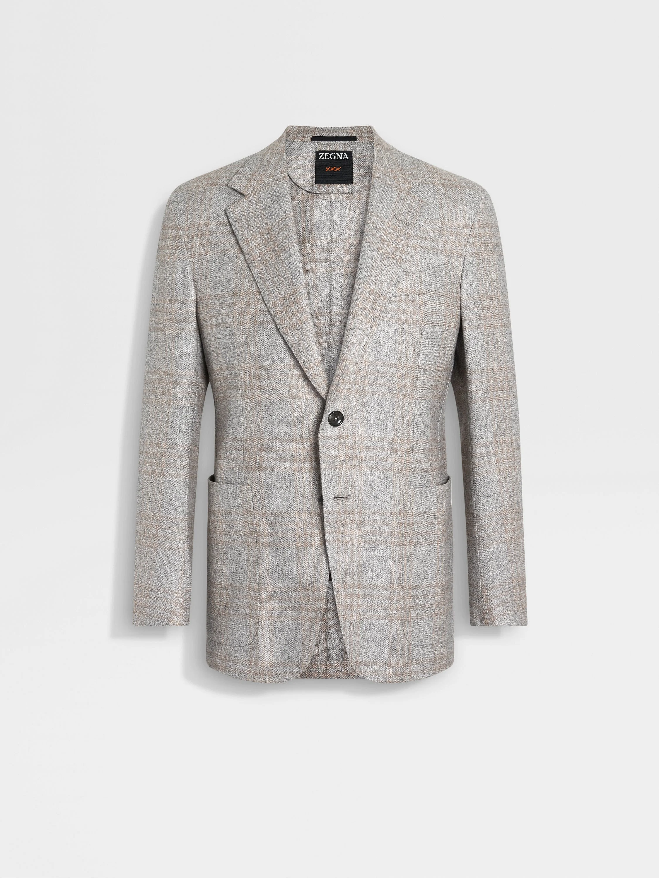 Embrace effortless elegance in this light grey and light taupe macro-checked jacket, made from luxurious cashmere-silk. INFO Nothing says fine tailoring like a luxurious blend of cashmere-silk and timeless sartorial details. This jacket boasts a macro-checked pattern in light grey and light taupe hues. Styled with classic notch lapels and patch pockets. PRODUCT CODE 259051A2-10JCN0 MATERIALS AND CARE 51% Mulberry Silk; 49% Cashmere Do not wash. Do not bleach. Do not tumble dry. Iron at max 110° C. Professional dry cleaning in tetrachloroethene and hydrocarbons, mild process. FIT AND PRODUCT DETAILS • Regular fit • Tailoring jacket • Double vents • Notch lapels • Macro-checked pattern • Button closure • Patch pockets • Deconstructed, canvas • Unlined • 75 cm length on size 48