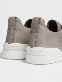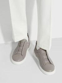 The light grey SECONDSKIN Triple Stitch™ sneakers perfectly mold to your foot. INFO The light grey SECONDSKIN Triple Stitch™ sneakers are crafted from specially selected calf leather for even more flexibility. The brand’s signature triple-crossed elastic detail ensures an easy slip-on fit, while evoking the traditional hand-stitching of tailored jackets to symbolize and honor Zegna’s legacy of fine craftsmanship. The super soft, light uppers are complemented by a white rubber sole. Customize these sneakers with our Made to Measure Service. For more information, please contact our Customer Care or visit your nearest stores. PRODUCT CODE LHOTA-S5207Z-OYS MATERIALS AND CARE Calfskin SECONDSKIN is crafted by tanneries selected for their renowned expertise. Fine, supple and incredibly soft to the touch, it moulds to your proportions over time — offering impeccable comfort with each wear. Clean with a soft cloth. Avoid contact with abrasives, water and substances containing alcohol, such as perfumes, solvents, etc. In case of contact with water, it is important to let the footwear dry completely before cleaning. Clean the rubber soles with a product specifically designed for cleaning rubber. Store in the included dust bag in a cool, dry place. FIT AND PRODUCT DETAILS • Crossed elastics • Extra-light white rubber sole • Sanitized® removable footbed • Made in Italy • Comes with a shoe bag We want every pair of Triple Stitch™ sneakers to fit perfectly anytime, anywhere, anyplace. To find your perfect fit, we recommend going down a half-size compared to your usual shoe size. Please note that Zegna uses UK sizing. For further information, please contact us via our customer service channels or by visiting the nearest Zegna flagship store.