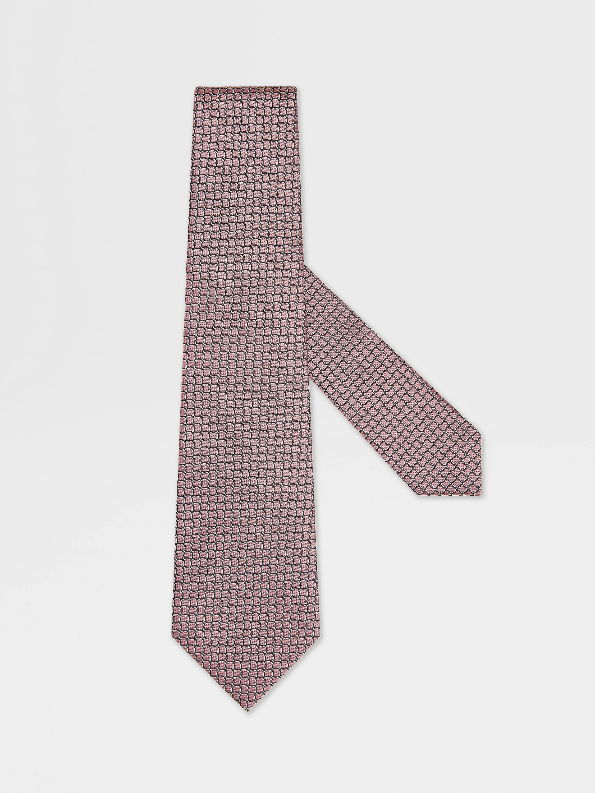 This jacquard tie brings modern charm to formal looks with its light pink netting pattern. INFO Elevate office-to-evening ensembles in this luxuriously soft pure Mulberry silk tie. An elegant pink colorway provides the perfect backdrop for a distinctive netting pattern. PRODUCT CODE Z2C42TA2-1PC-PI1 MATERIALS AND CARE Main body: 100% Mulberry Silk Lining: 100% Mulberry Silk Do not wash. Do not bleach. Do not tumble dry. Do not iron. Professional dry cleaning in tetrachloroethene and hydrocarbons, mild process. FIT AND PRODUCT DETAILS • Blade width: 8 cm / 3.1 in • Netting pattern