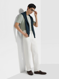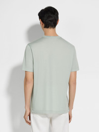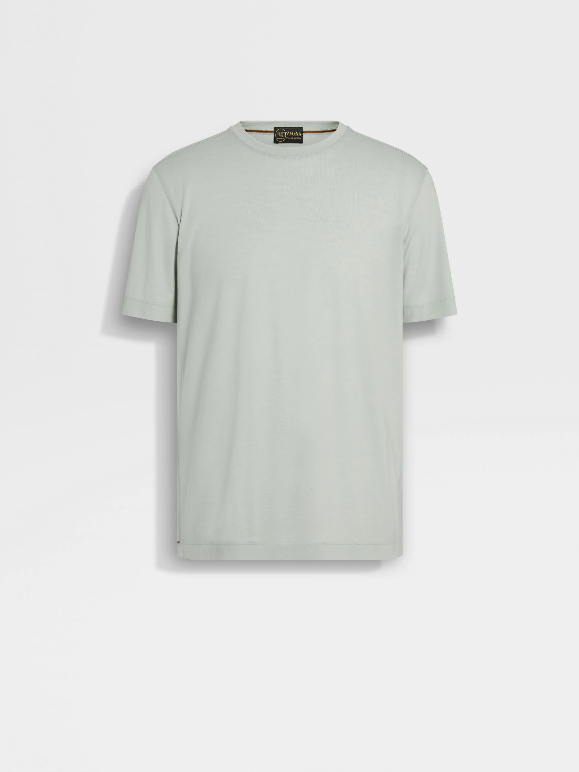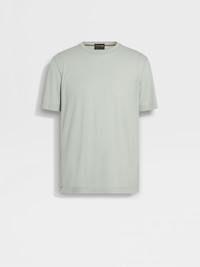 Introducing the light sage green Vellus Aureum T-shirt. Exceptional softness meets understated style for everyday wear. INFO The light sage green Vellus Aureum T-shirt reimagines a wardrobe staple through the lens of unique quality. Crafted from exceptionally fine wool, it offers softness and refinement. The regular fit, crewneck collar and short sleeves maintain a classic silhouette, while the tubular hem and cuffs ensure a clean finish. PRODUCT CODE UFV97A9-FV7VL8-V01 MATERIALS AND CARE 100% Wool Vellus Aureum was inspired by our founder's quest for excellence to seek the finest wool in the world. Exquisitely fine in texture and rare, we're committed to certifying Vellus Aureum fibres as 100% traceable by the end of 2025. Do not wash. Do not bleach. Do not tumble dry. Iron at max 110°C. Professional dry cleaning in hydrocarbons. FIT AND PRODUCT DETAILS • Short sleeves • Crewneck collar • Tubular hem and cuffs • Regular fit