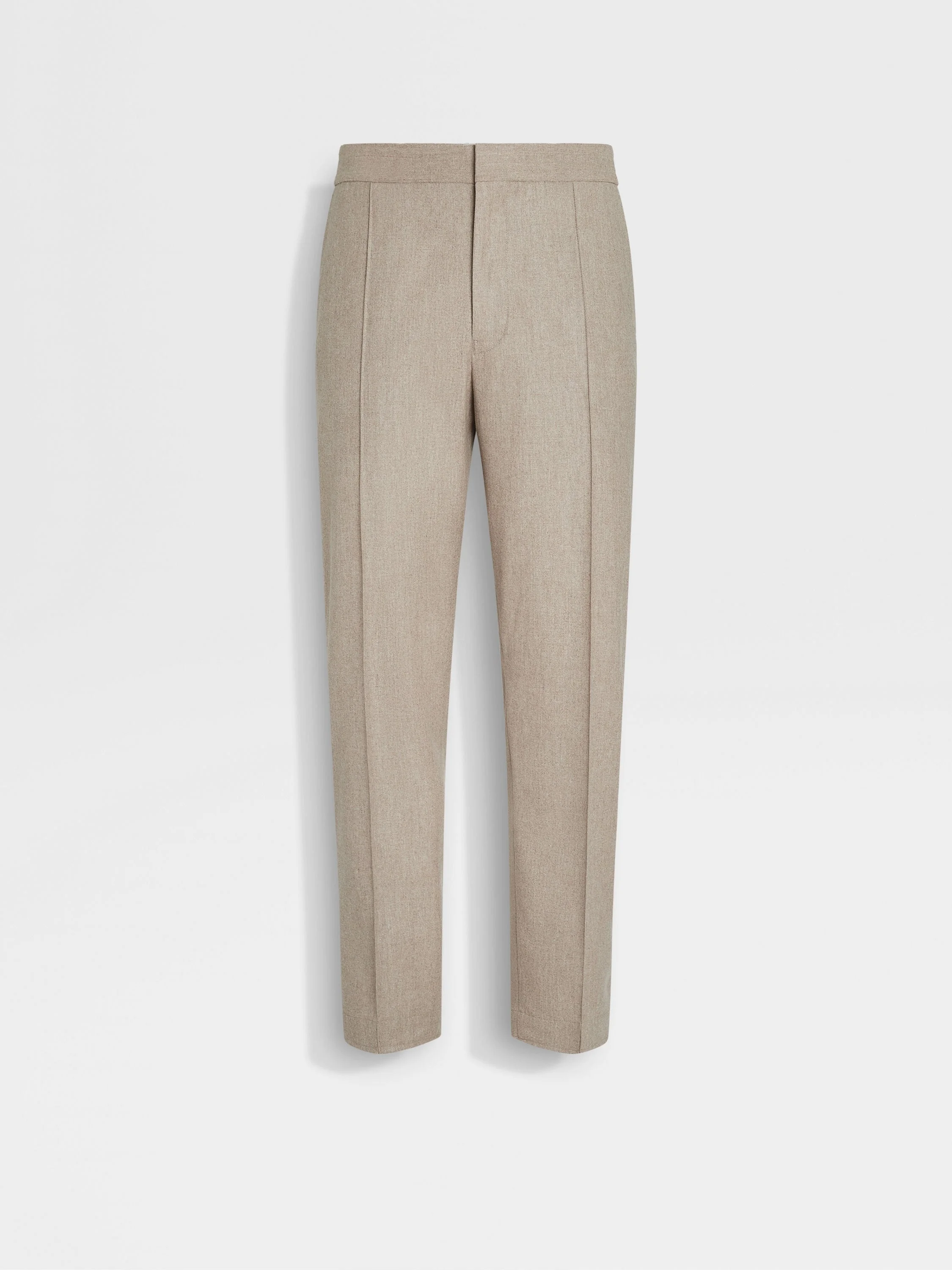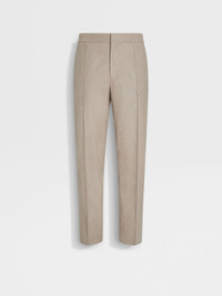 These light taupe pants are crafted from a blend of 15milmil15 wool, silk and cashmere. INFO Choose elevated leisurewear in these exquisitely lightweight light taupe 15milmil15 pants, blending meticulously selected wool fibers with silk and cashmere. Styled with a flat front and sleek slant pockets for a streamlined look. PRODUCT CODE UGI20A2-TT46-N92 MATERIALS AND CARE Main body: 89% Wool; 6% Mulberry Silk; 5% Cashmere Lining: 100% Cotton 15milmil15 is crafted from superfine wool that measures just 15.2 microns in diameter. Incredibly soft and lightweight, it is well suited for sophisticated garments. Do not wash. Do not bleach. Do not tumble dry. Iron at max 110°C. Professional dry cleaning in hydrocarbons, mild process. Wash inside out. Protect metal tips during washing. FIT AND PRODUCT DETAILS • Regular fit • 19 cm open hem • Button, hook and zip closure • Elasticated back waistband • Comes with loops in a separate pouch for tailor application • Slanted pockets and back welt pockets • Flat front style • Front pintuck