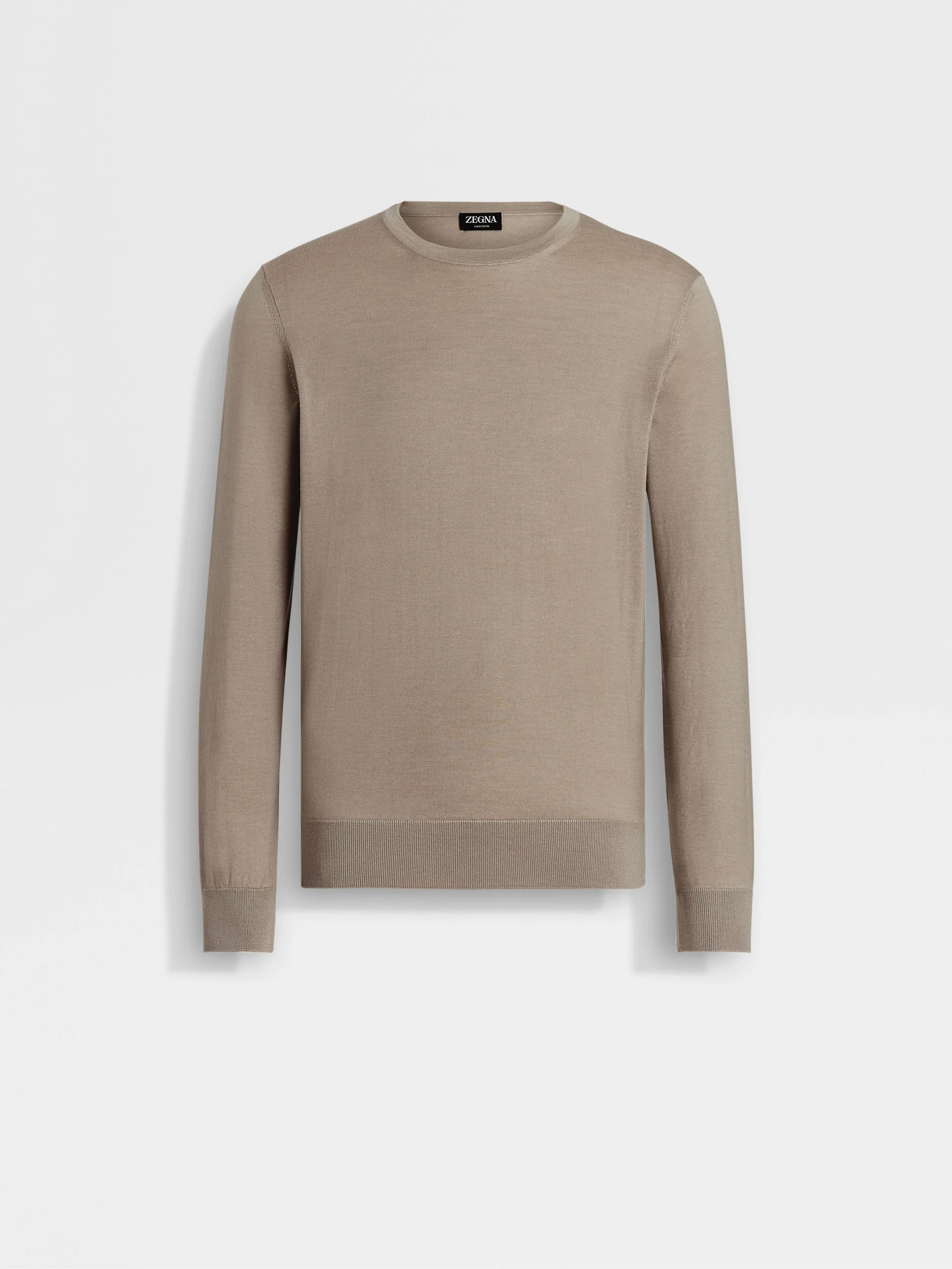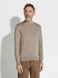 The light taupe Cashseta crewneck brings together the best of cashmere and silk. INFO Zegna's refined blend of luxury fibers lends the light taupe Cashseta crewneck its distinctive finish. The natural knit feels soft against the skin, turning a simple design into a sophisticated essential. This special material is yarn-dyed, creating subtle variations in each garment. PRODUCT CODE UEJ00A8-110-N92 MATERIALS AND CARE 70% Cashmere; 30% Mulberry Silk This sophisticated fabric combines the softness of cashmere with the smooth finish of fine silk. The yarns of Cashseta are dyed before the fabric is created, resulting in a melange that is unique to each garment. Wash by hand. Do not bleach. Do not tumble dry. Flat drying. Iron at max 110°C. Professional dry cleaning in hydrocarbons, mild process. Wash and iron inside out. FIT AND PRODUCT DETAILS • 18 gauge • Ribbed crewneck collar • Long sleeves • Ribbed trims