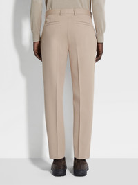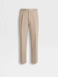 The light taupe cotton and wool pants are a sophisticated everyday staple. INFO Styled with a crisp pleat in the front, the light taupe cotton and wool pants are made from a lightweight blend of natural materials. Soft and breathable, they hold their shape throughout busy days. The pants have slanted pockets and a welt pocket on the back. PRODUCT CODE UEI04A8-TP45-N02 MATERIALS AND CARE Main body: 57% Cotton; 43% Wool Lining: 100% Cotton Do not wash. Do not bleach. Do not tumble dry. Iron at max 110°C. Professional dry cleaning in hydrocarbons, mild process. Wash inside out. FIT AND PRODUCT DETAILS • Pleated fit • 19.5 open hem • Zip and button closure • Slanted pockets and back welt pocket