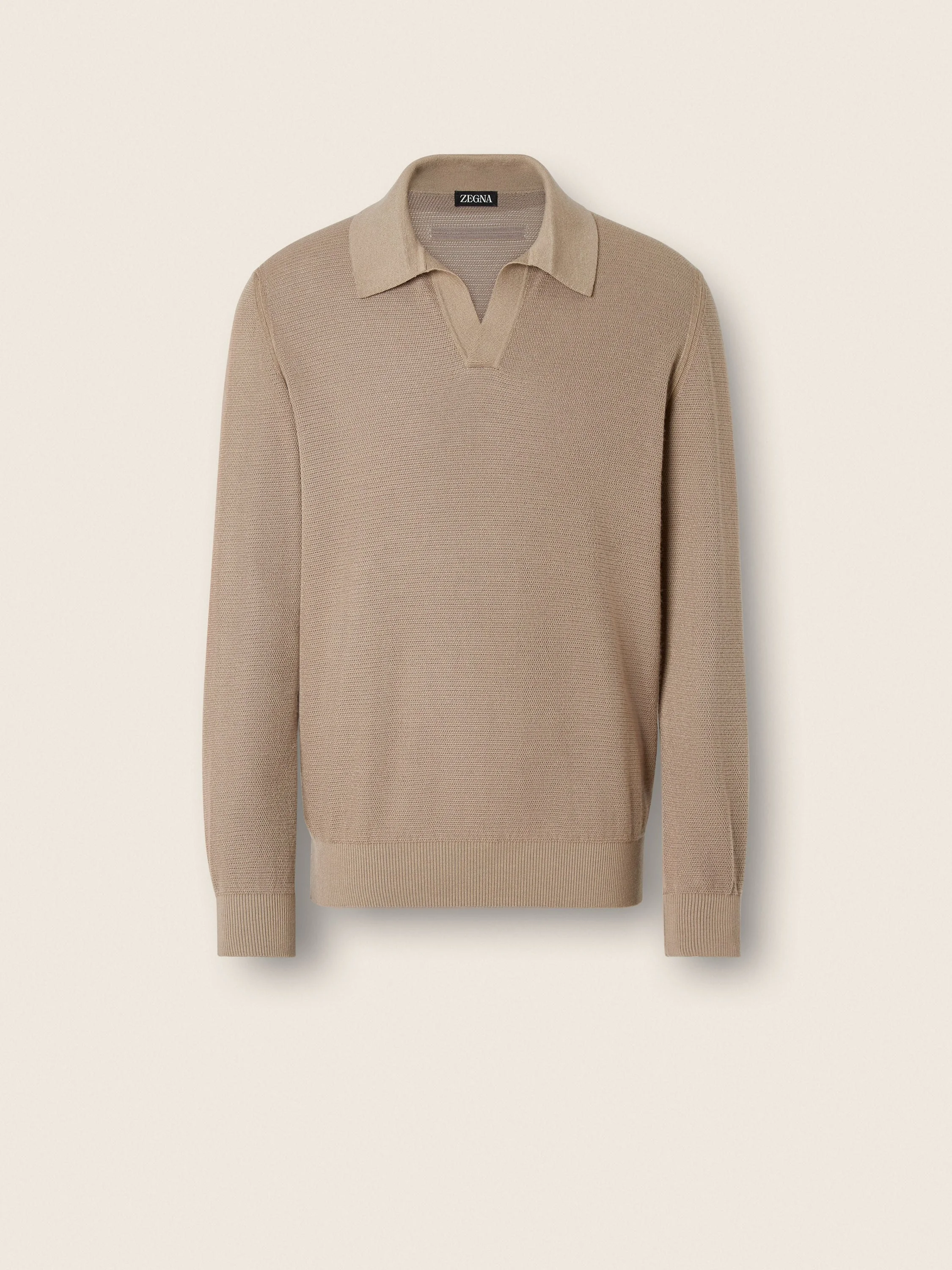 The cornerstone of your everyday wardrobe, this light taupe melange polo shirt is crafted from refined cashmere-silk. INFO A luxurious blend of cashmere and silk elevates this long-sleeved polo shirt to luxury status. Sitting effortlessly against the body with a beautiful drape, it comes in a refined Sabbia Oasi melange hue and features a sleek open collar. Sabbia Oasi (ˈsab’bja) – ITALIAN FOR 'SAND', this is the color of a living entity, of the sunlit trails of Oasi Zegna. The tone is identified as warm, light taupe. PRODUCT CODE UHH95A3-131-N92 MATERIALS AND CARE 70% Cashmere; 30% Mulberry Silk Do not wash. Do not bleach. Do not tumble dry. Iron at max 110°C. Professional dry cleaning in hydrocarbons. Wash and iron inside out. FIT AND PRODUCT DETAILS • Regular fit • 18 gauge • Open polo collar • Long sleeves • Ribbed hem and cuffs
