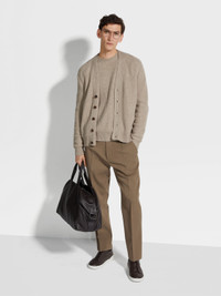 The light taupe Oasi Cashmere cardigan is knit from one of Zegna's most exclusive fibers. INFO An elegant, English rib pattern highlights the light taupe Oasi Cashmere cardigan's superfine natural yarn. This sophisticated layering piece features a classic, V-neck collar. Ribbed trim completes the look. PRODUCT CODE UEK81A8-156-N92 MATERIALS AND CARE 100% Cashmere The inspiration behind this Oasi Cashmere Collection garment was Born in Oasi Zegna, our 100km² natural territory and the home of our values. It's crafted from Oasi Cashmere fibres, which ZEGNA commits to certifying as traceable from 2024. The Oasi Cashmere Collection follows in the footsteps of our founder, who envisioned a vertically integrated system of producing textiles. Wash by hand. Do not bleach. Do not tumble dry. Flat drying. Iron at max 110°C. Professional dry cleaning in hydrocarbons, mild process. Wash and iron inside out. FIT AND PRODUCT DETAILS • English rib stitch • 8 gauge • V-neck collar • Long sleeves • Button closure • Ribbed trims