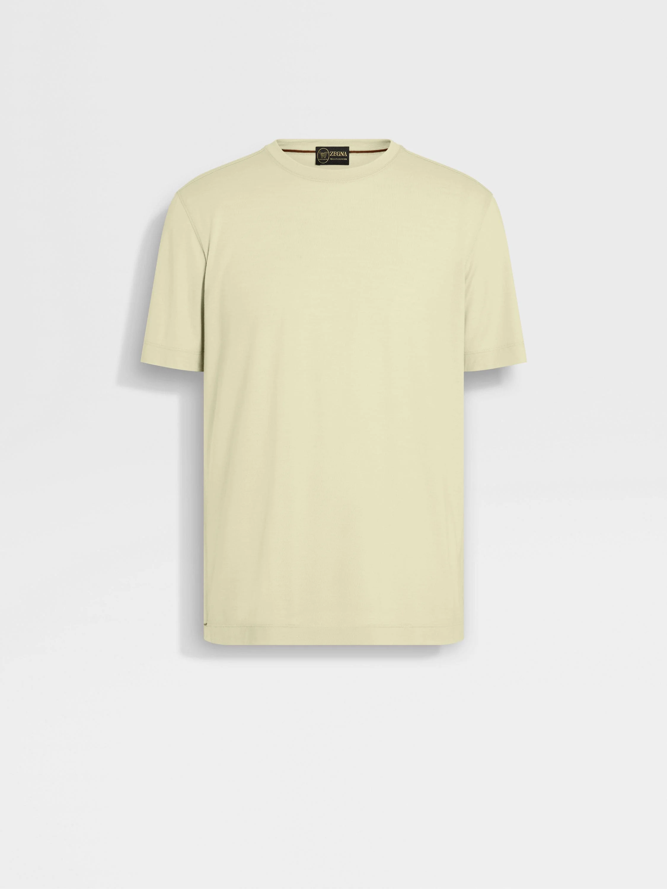 Introducing the light yellow Vellus Aureum T-shirt. Exceptional softness meets understated style for everyday wear. INFO The light yellow Vellus Aureum T-shirt reimagines a wardrobe staple through the lens of unique quality. Crafted from exceptionally fine wool, it offers softness and refinement. The regular fit, crewneck collar and short sleeves maintain a classic silhouette, while the tubular hem and cuffs ensure a clean finish. PRODUCT CODE UFV97A9-FV7VL8-G01 MATERIALS AND CARE 100% Wool Vellus Aureum was inspired by our founder's quest for excellence to seek the finest wool in the world. Exquisitely fine in texture and rare, we're committed to certifying Vellus Aureum fibres as 100% traceable by the end of 2025. Do not wash. Do not bleach. Do not tumble dry. Iron at max 110°C. Professional dry cleaning in hydrocarbons. FIT AND PRODUCT DETAILS • Short sleeves • Crewneck collar • Tubular hem and cuffs • Regular fit