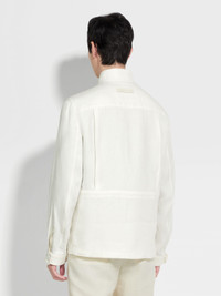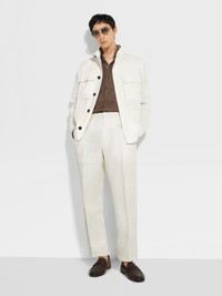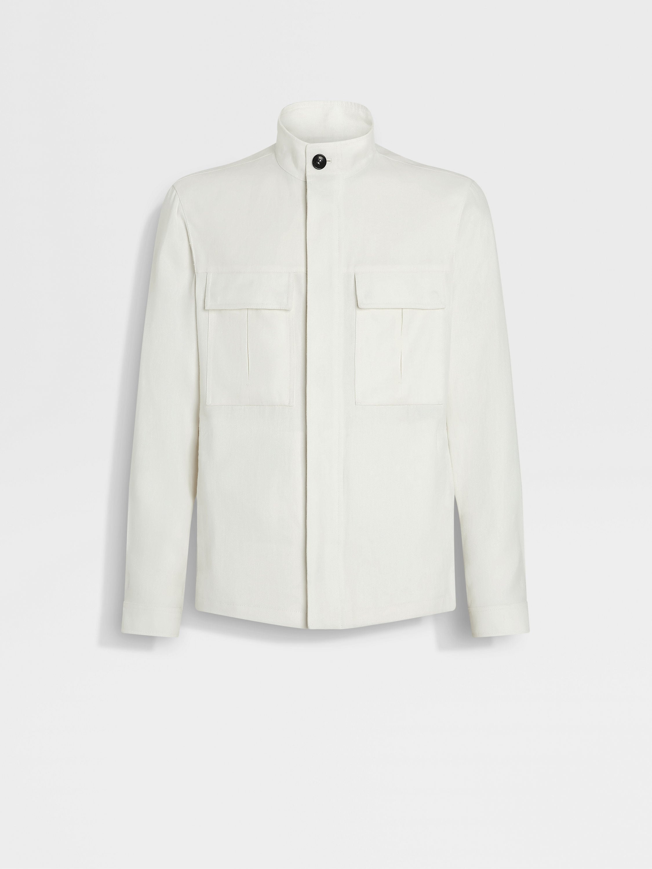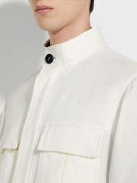 This white field jacket elevates a timeless off-duty silhouette in ZEGNA's iconic Oasi Lino. INFO Luxury leisurewear at its finest: this white field jacket is beautifully crafted from ZEGNA's Oasi Lino, honoring our commitment to traceability and sustainability. Featuring a stand collar and straight hem, its laid-back silhouette is cinched in at the waist with an adjustable drawstring. PRODUCT CODE UFT55A9-F256-N01 MATERIALS AND CARE Main body: 100% Linen Leather details: Calf Leather The inspiration behind this Oasi Lino garment was Born in Oasi Zegna, a 100km² natural territory and the home of our values. Crafted from European-grown flax fibres that are certified as 100% traceable from 2024, Oasi Lino follows in the footsteps of our founder, who envisioned a vertically integrated system of producing textiles. Do not wash. Do not bleach. Do not tumble dry. Iron at max 110° C. Professional dry cleaning in hydrocarbons, mild process. Professional leather clean only. Protect leather details before washing. Protect the metal accessories during washing. FIT AND PRODUCT DETAILS • Regular fit • Stand collar • Snap and zip closure • Straight hem • Adjustable cuffs • Chest flap patch pockets • Lower standing pocket • Leather details • Drawstring at the waist • 73 cm length on size 48