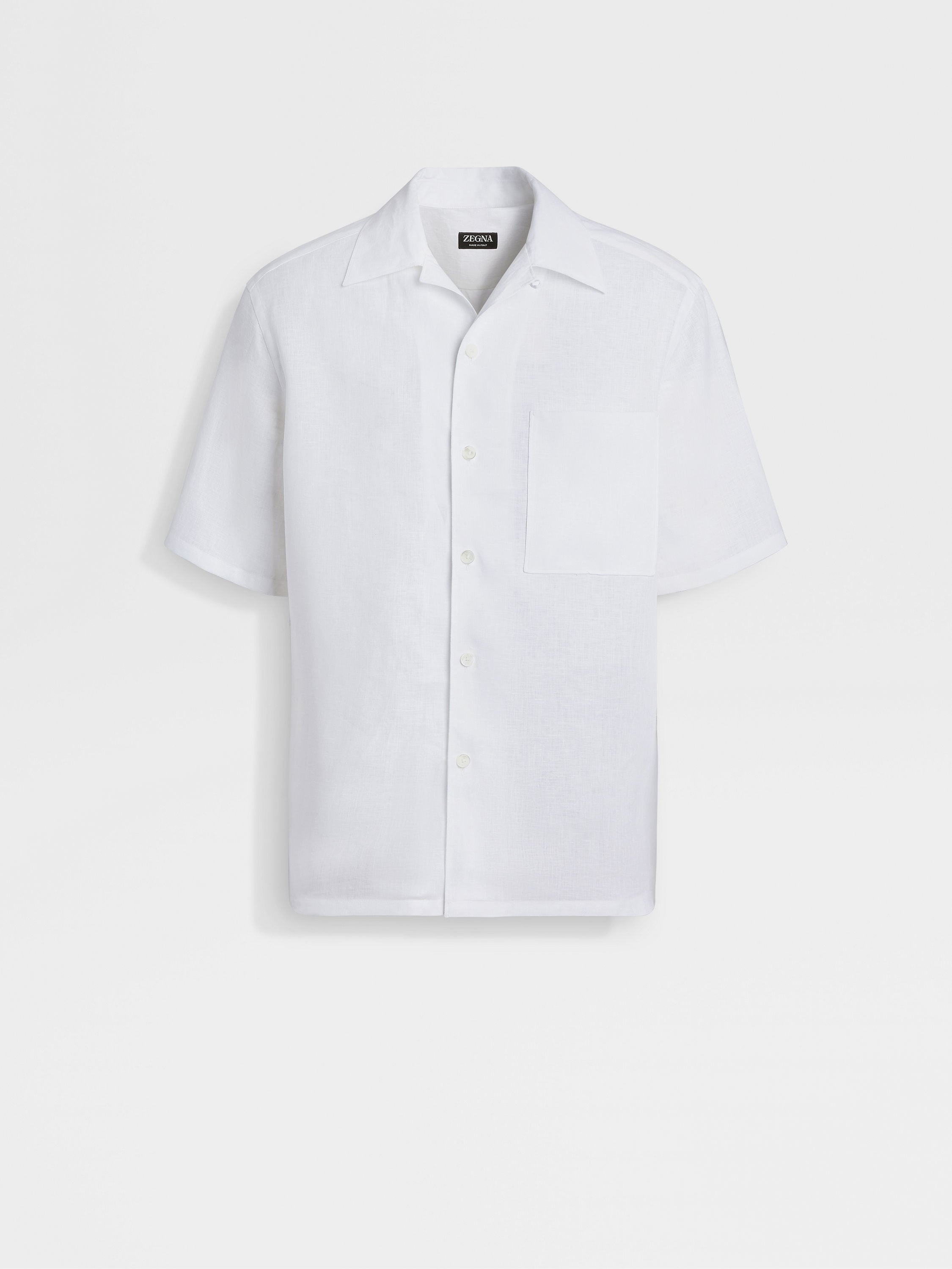 The white linen short-sleeve shirt is topped off with a relaxed Cuban collar. INFO Naturally fresh and breathable, the white linen shirt's refined fabric is ideal for effortless sophistication. The short-sleeve, pure linen shirt is a staple of refined casual wardrobes thanks to its finely crafted details. PRODUCT CODE UCX31A6-SCP5-014 MATERIALS AND CARE 100% Linen Max washing temp 40°C. Do not bleach. Do not tumble dry. Iron at max 150°C. Professional dry cleaning in tetrachloroethene and hydrocarbons. FIT AND PRODUCT DETAILS • Regular fit • Cuban collar • Button closure • Straight hem • 71 cm length on size 39 • Model is 188 cm tall (6.2 feet) and wears an Italian size 39.