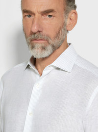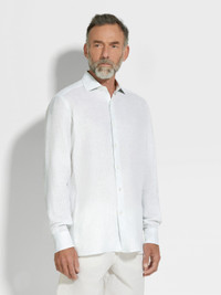 This light blue and white striped Oasi Lino shirt is made from Zegna's 100% traceable, European-grown linen. INFO This Oasi Lino shirt exudes authentic charm thanks to the distinctive texture of its pure linen weave: soft, breathable, and key for creating elegant warm-weather looks. Its timeless light blue and white striped design is enriched with hand-stitched detailing. Styled with a semi-spread collar. PRODUCT CODE UFX27A9-SRF7-A01 MATERIALS AND CARE 100% Linen The inspiration behind this Oasi Lino garment was Born in Oasi Zegna, a 100km² natural territory and the home of our values. Crafted from European-grown flax fibres that are certified as 100% traceable from 2024, Oasi Lino follows in the footsteps of our founder, who envisioned a vertically integrated system of producing textiles. Max washing temp 30° C, mild process. Do not bleach. Do not tumble dry. Iron at max 110° C. Professional dry cleaning in tetrachloroethene and hydrocarbons. FIT AND PRODUCT DETAILS • Regular fit • Semi-spread collar • Standard cuffs • Button closure • Rounded hem • Striped pattern • Hand-stitched details • 79 cm length on size 39