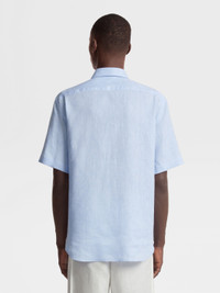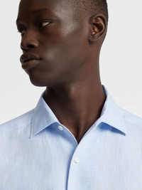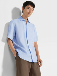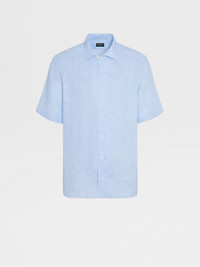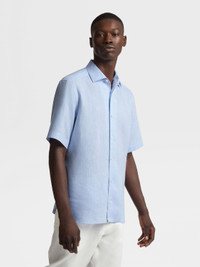 The light blue pure linen short-sleeve shirt is a versatile favorite. INFO Made from a lightweight natural material, the light blue pure linen short-sleeve shirt feels fresh against the skin. The short-sleeve shirt is styled with a one-piece collar and hand-stitched details. PRODUCT CODE UCX31A6-SCO3-016 MATERIALS AND CARE 100% Linen Max washing temp 30°C, mild process. Do not bleach. Do not tumble dry. Iron at max 110°C. Professional dry cleaning in tetrachloroethene and hydrocarbons. FIT AND PRODUCT DETAILS • Regular fit • One-piece collar • Button closure • Rounded hem • Hand-stitched details • 79 cm length on size 39 • Model is 185 cm tall (6 feet) and wears an Italian size 39.